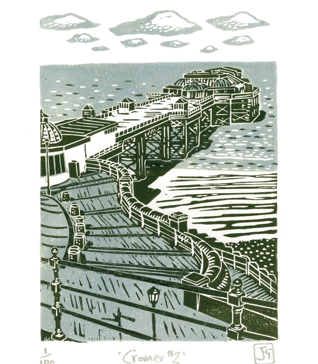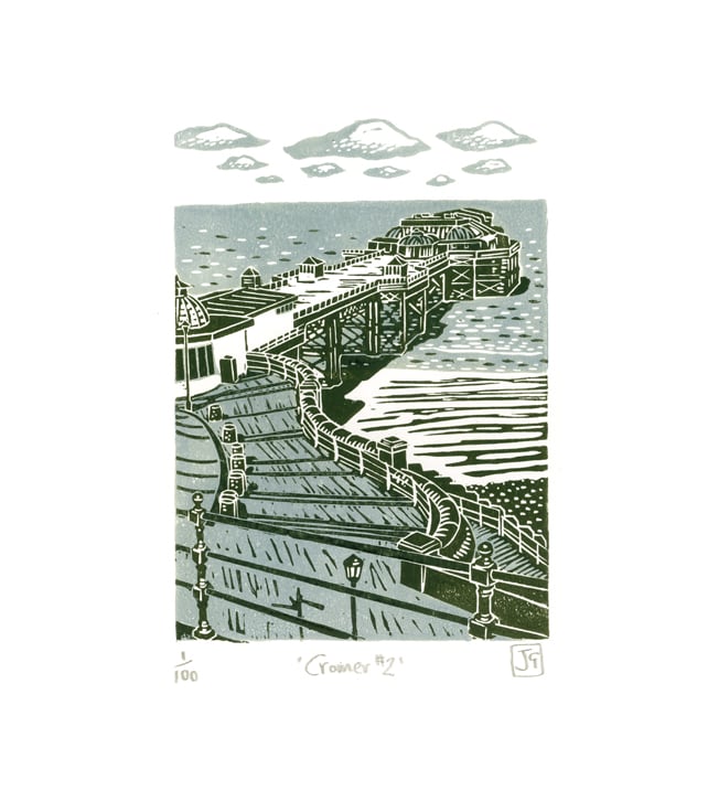This is my second hand-pressed print of Cromer in Norfolk. My first print was of the town from the pier, and on another recent visit I decided to do a reverse, so a view of the beautiful pier from the town!
