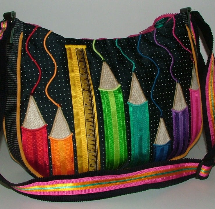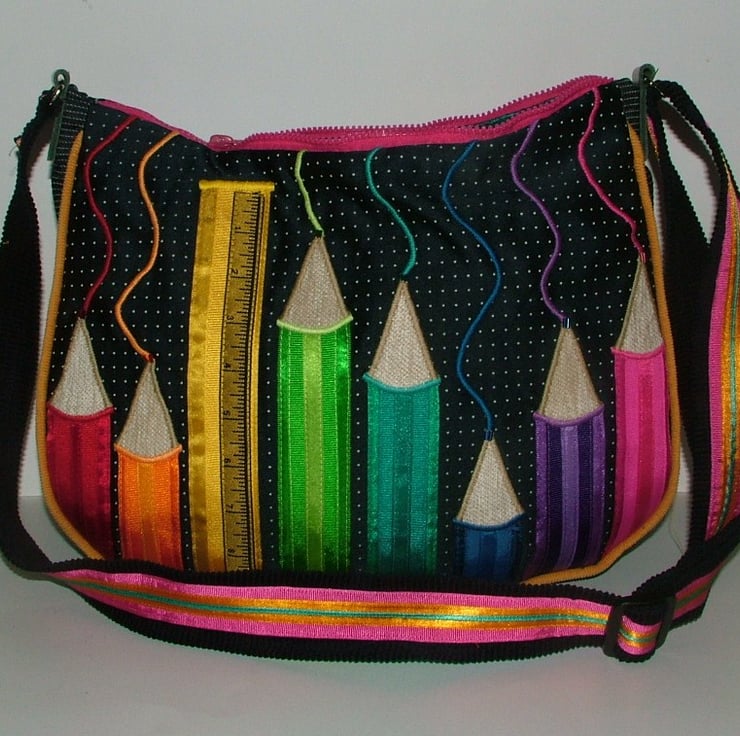 The front is made from a dashed Navy fabric that has been layered with 7 different coloured ribbons (3 different size ribbons on each pencil) to produce a multi coloured pencil effect,(there is also a yellow ruler) each pencil has been hand beaded to give the pencil leads an extra sparkle.