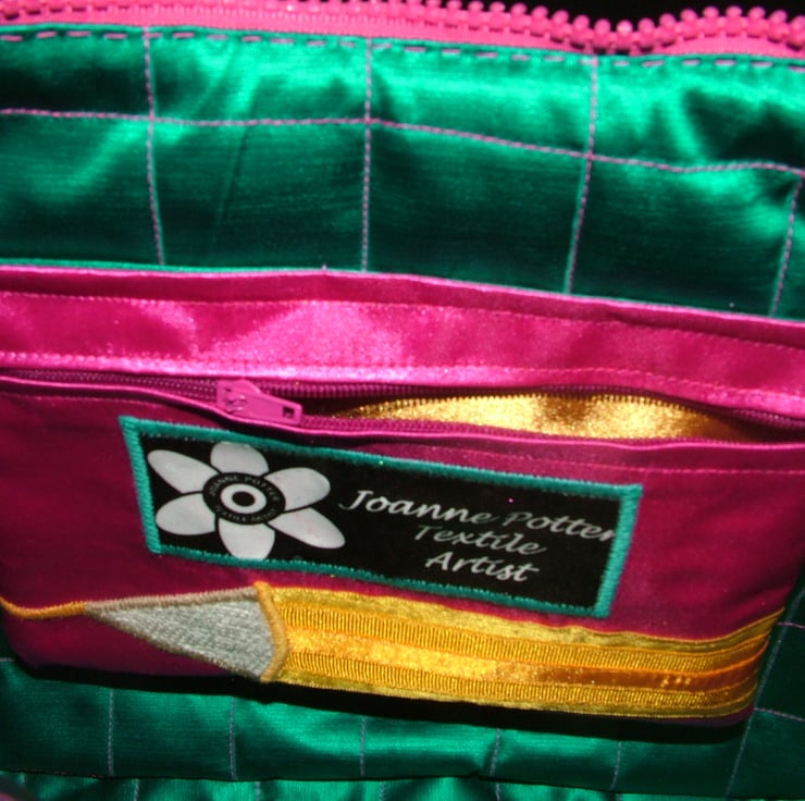 This bag has a pink chunky zip to fasten, inside is a quilted satin lining with contrast pink stitching. The bag has inside pocket with makers label and mini pencil. the lining has been hand stitched into bag for a totally quality finish.
