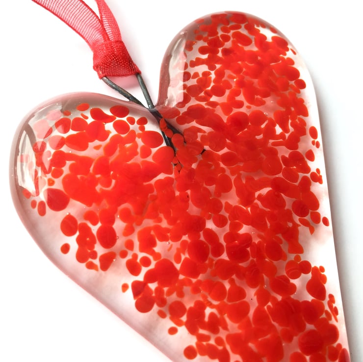 This clear glass heart is decorated with red glass frit (crushed glass) and is a beautiful, vibrant colour.