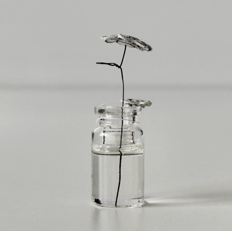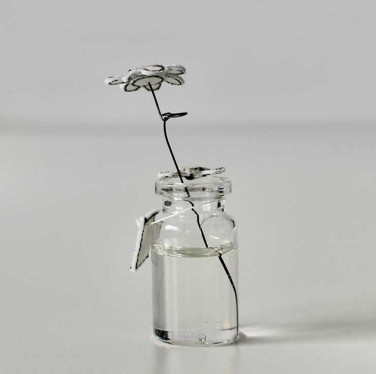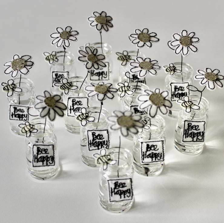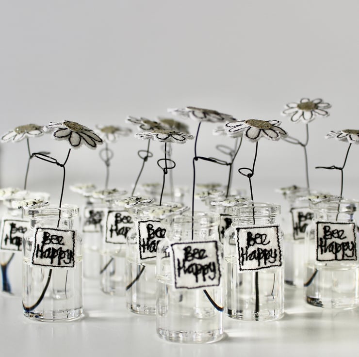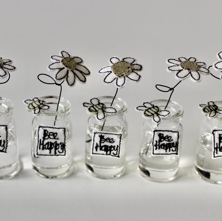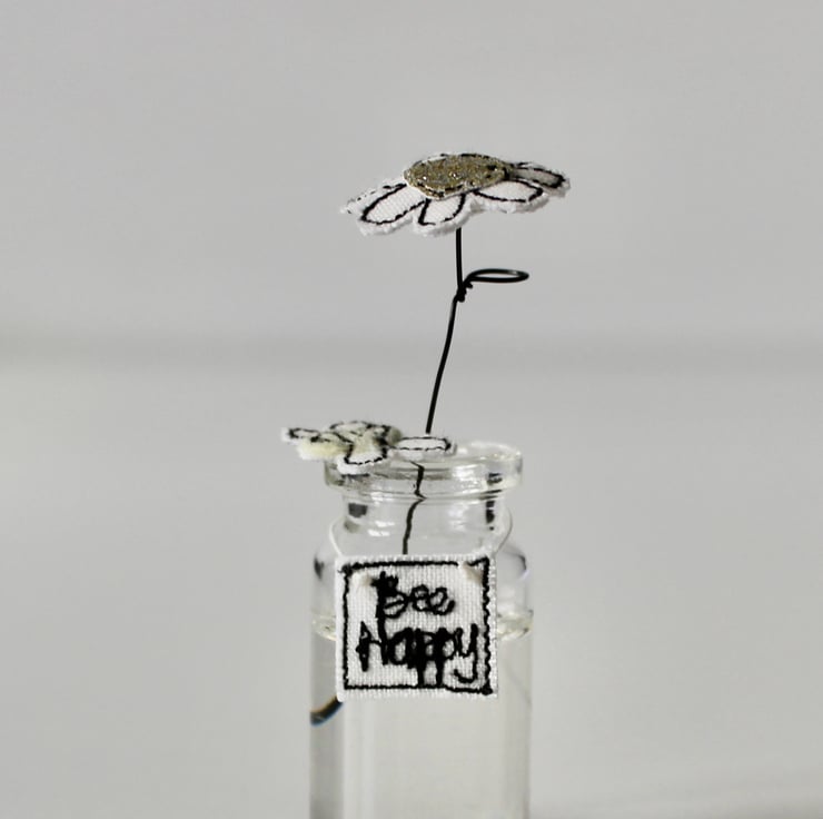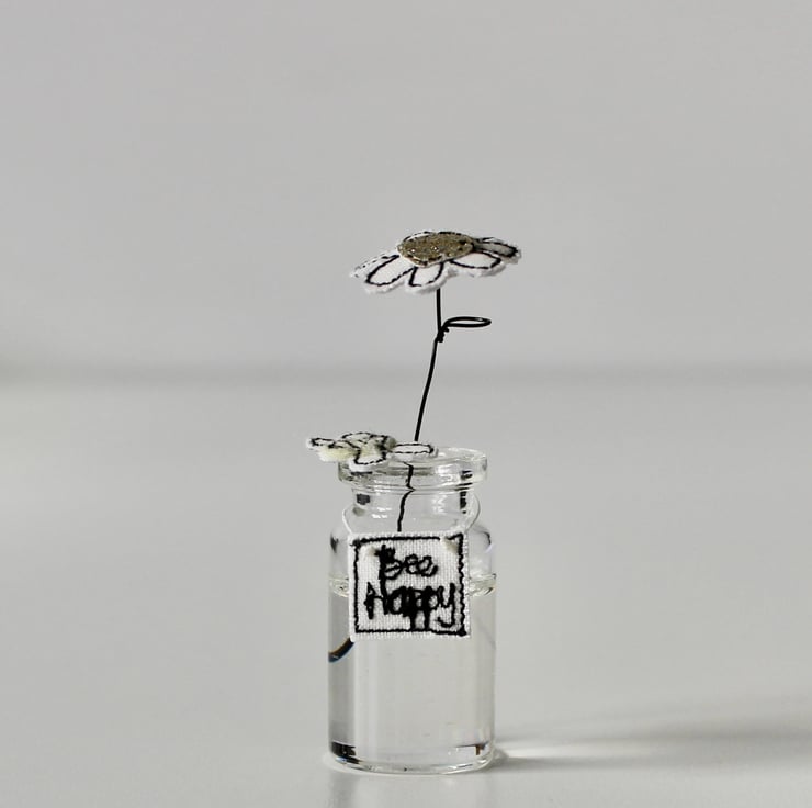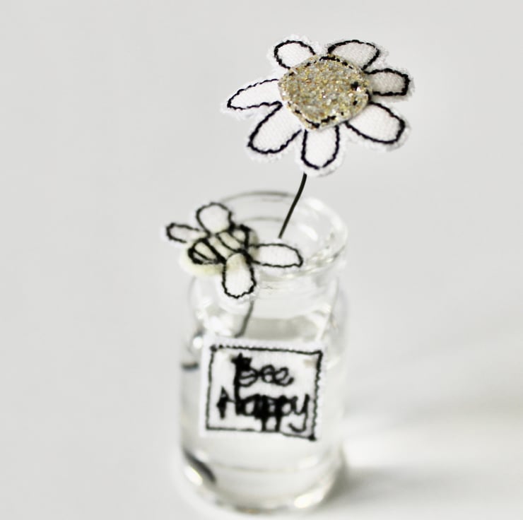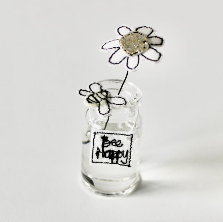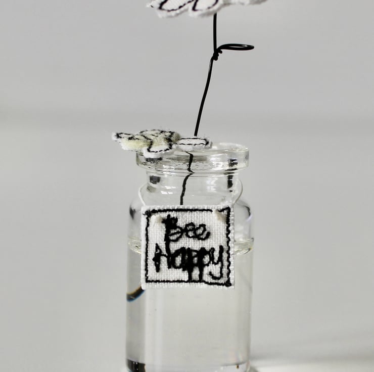 A sewn fabric daisy sits in a miniature glass bottle with with a wire stem holding it in position in acrylic water. Around the bottle neck there is a tiny fabric bee and a sewn fabric label saying 'Bee Happy'.