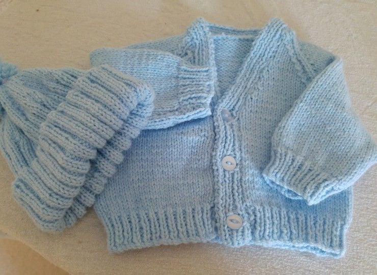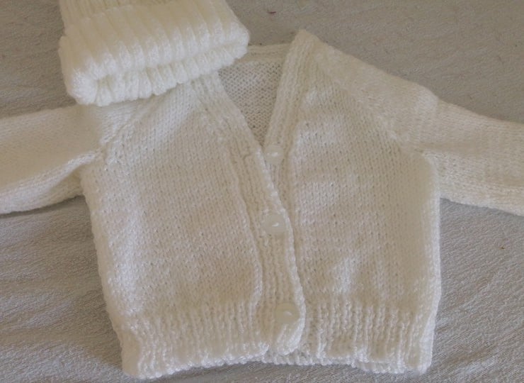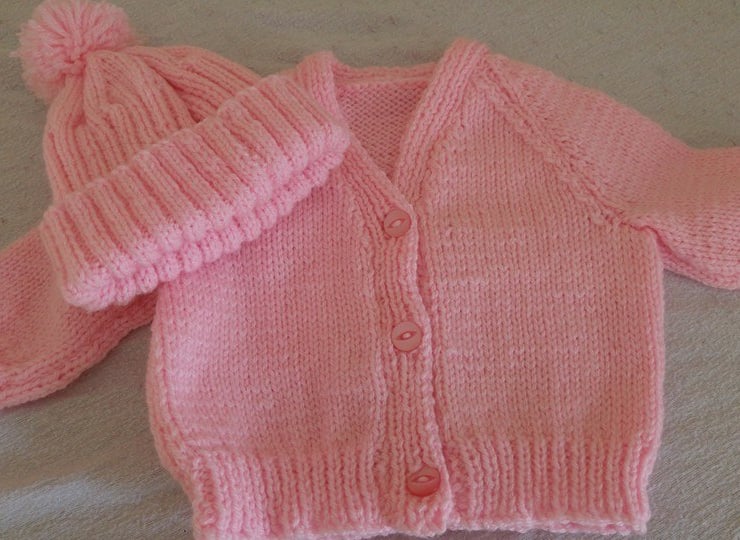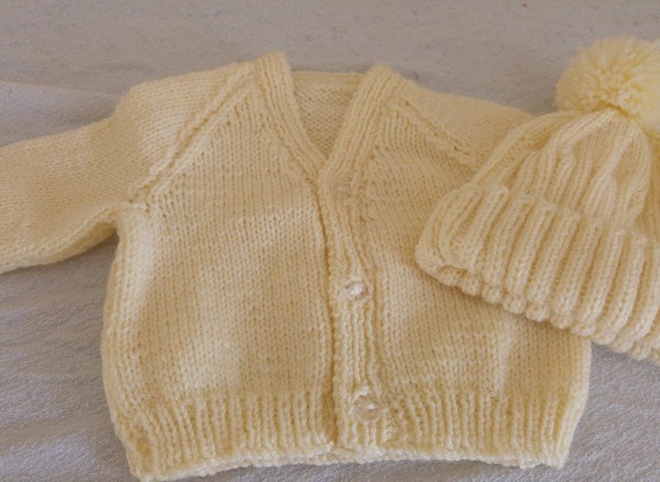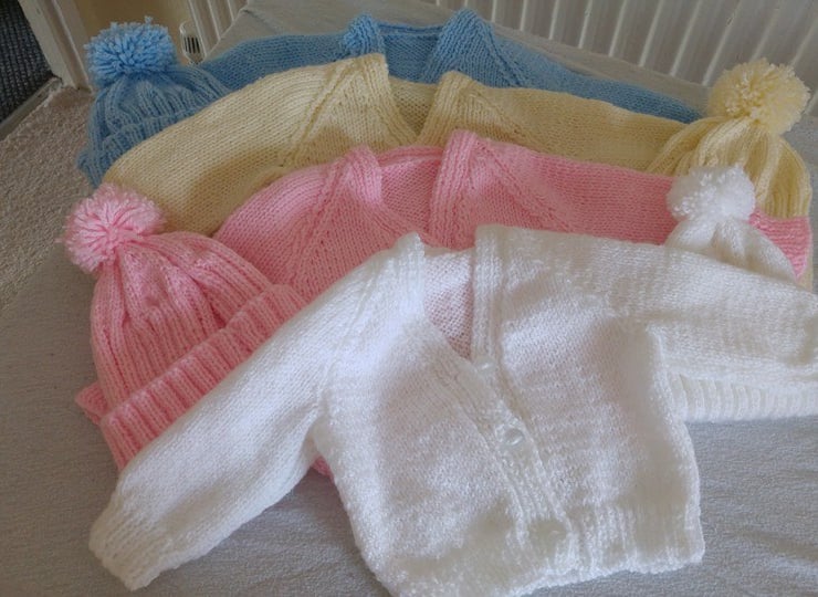 Gorgeous hand knit baby cardigans and Bobble hat sets