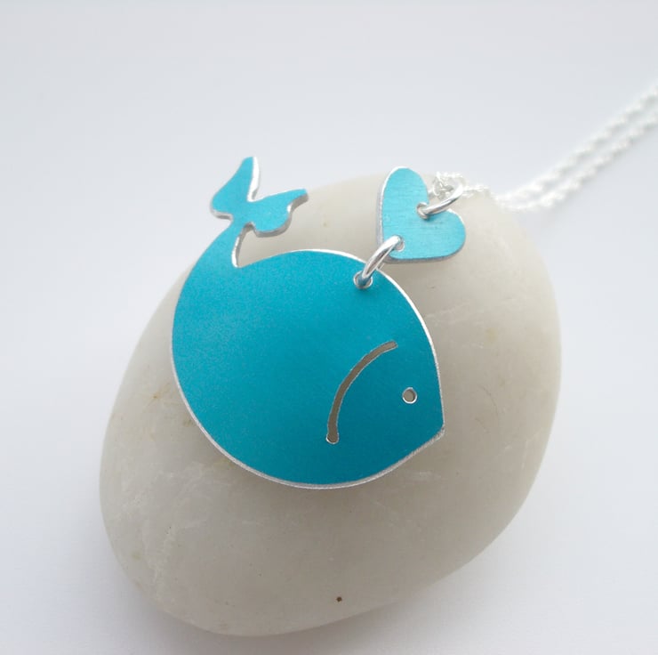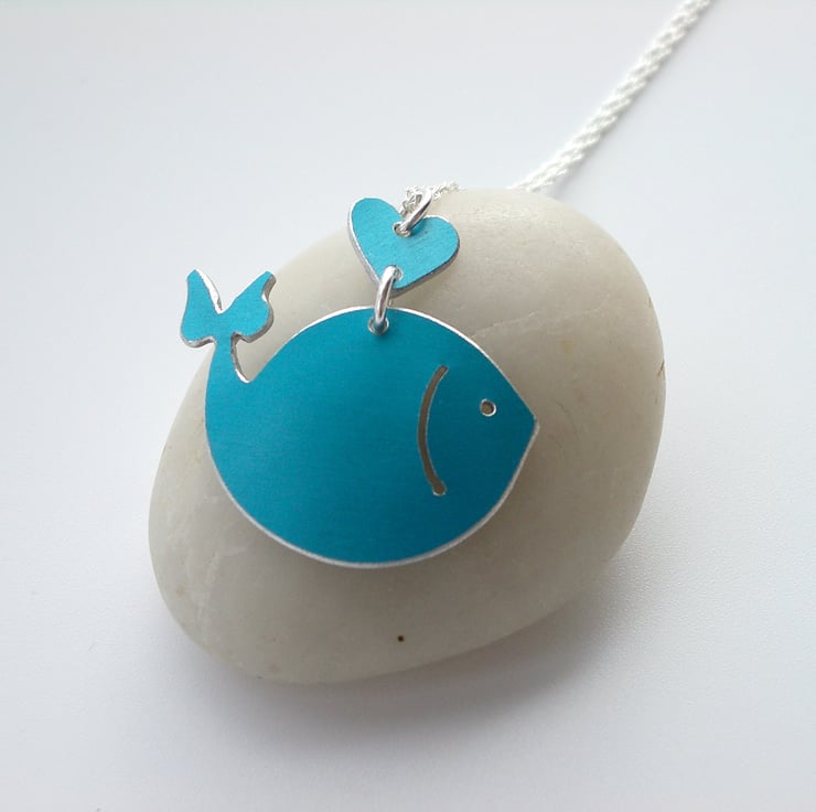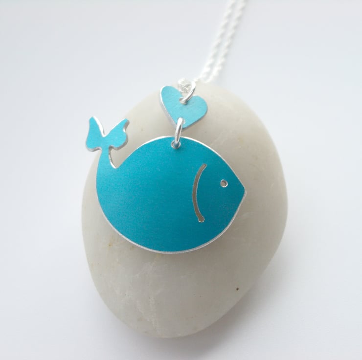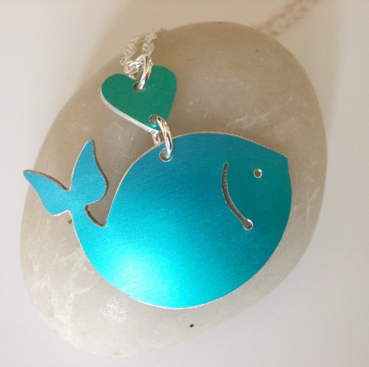 This sweet little pendant is hand made from aluminium which I have dip dyed in a gorgeous sea inspired turquoise blue and sealed so that the dye becomes a permanent part of the metal. I then saw pierce out the whale shape by hand, filing the edges so that there is a silvery outline. I have added a small blue/green heart which compliments the colour on the whale.