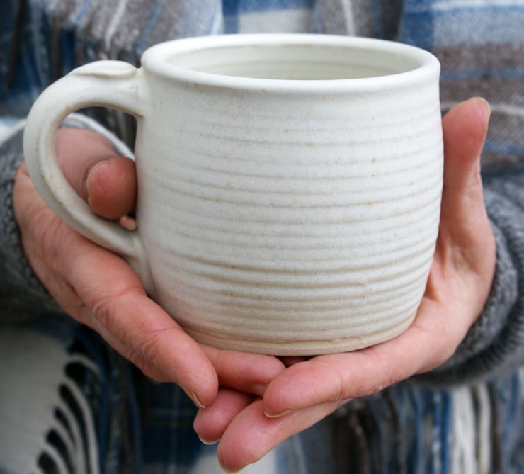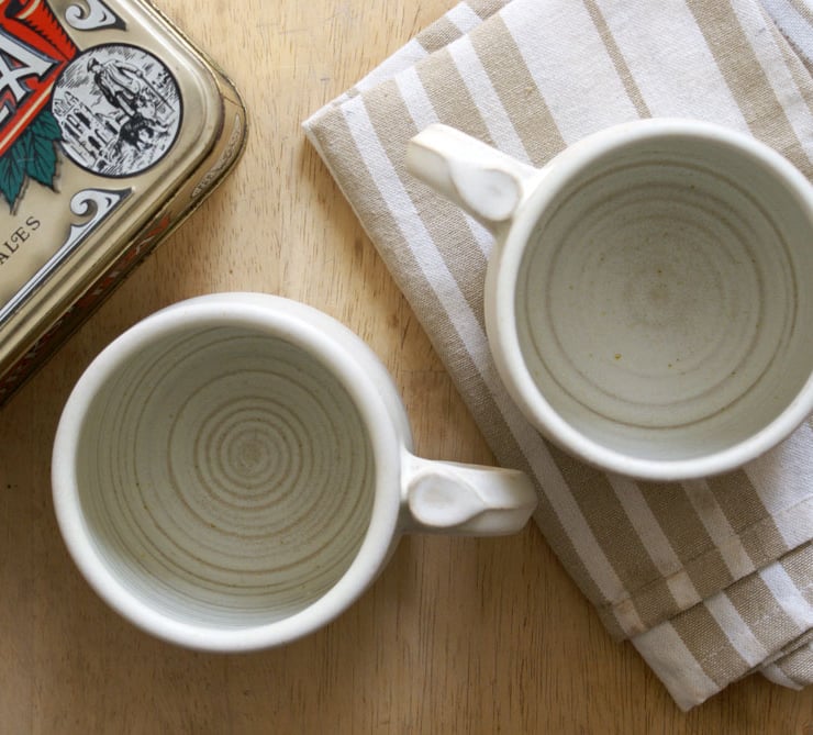 I created this pair of pottery mugs by hand throwing them on my wheel from durable British stoneware clay. Each mug features a curving shape with grooved throwing rings, a sturdy pulled handle and rounded drinking edge.