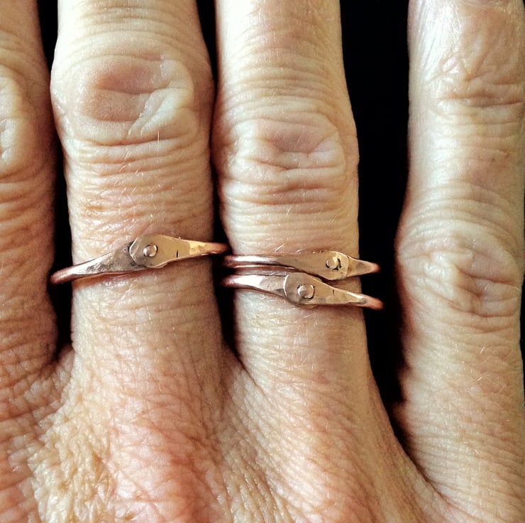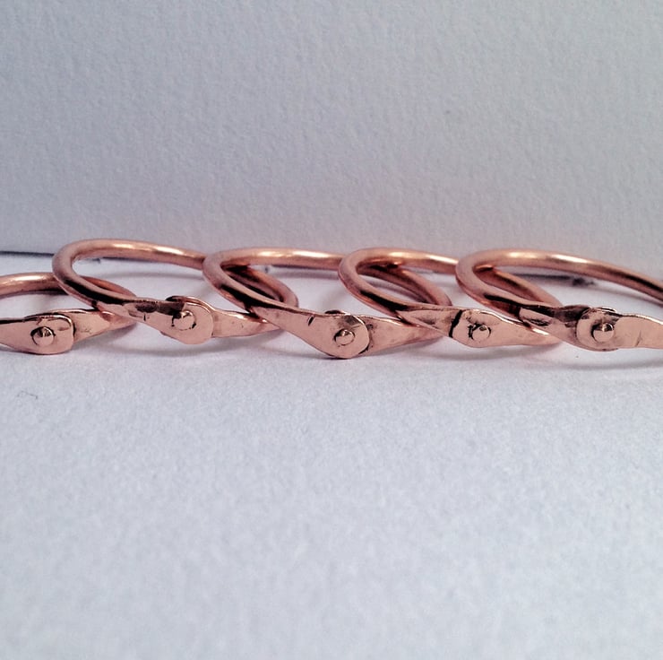 These lovely rustic rings are made from 15 gauge / 1.8mm solid copper hammered then drilled and cold connected with a copper rivet I formed by hand.