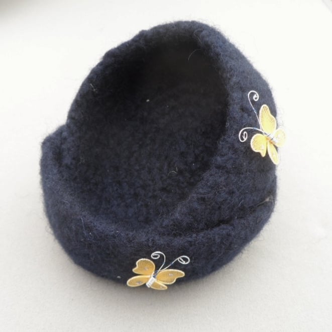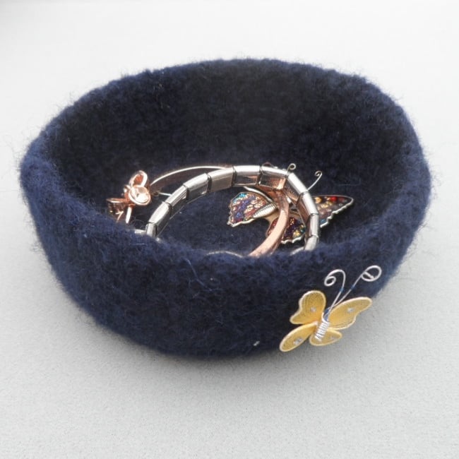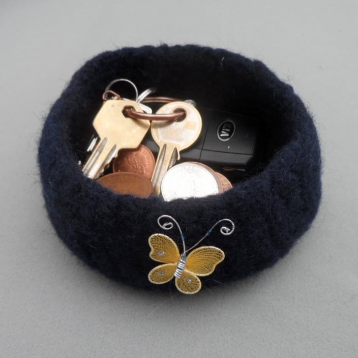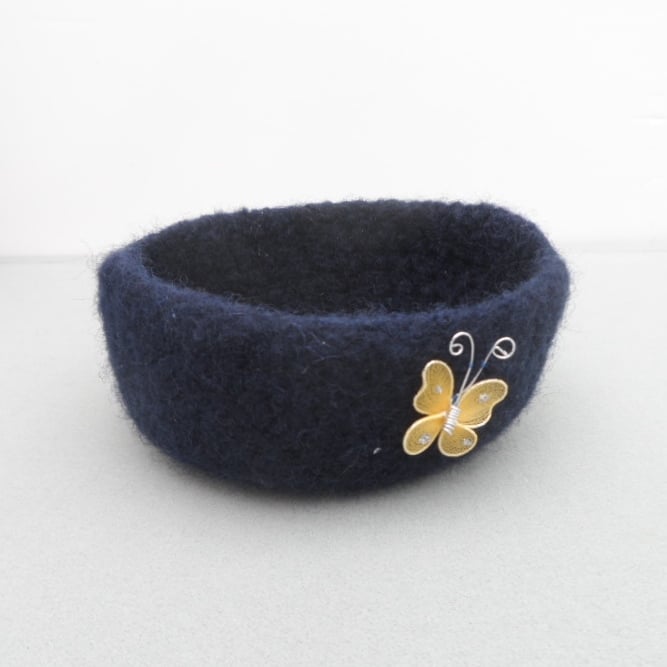 A pretty crocheted bowl which has been felted to create a soft but firm bowl that will hold its shape. Made from chunky 100% wool this bowl measures approximately 11cm (4.5") in diameter and about 5cm (2") high. A small yellow wire and organza butterfly has been attached to the side. Suitable for keeping small items safe this bowl could be used for small change, jewellery, pot pourri, small stationery items, keys or any other bits and pieces that need a home.
