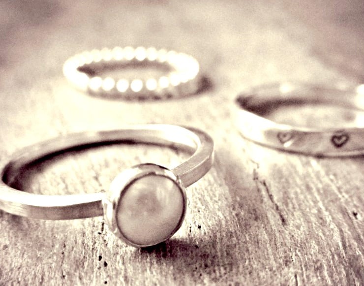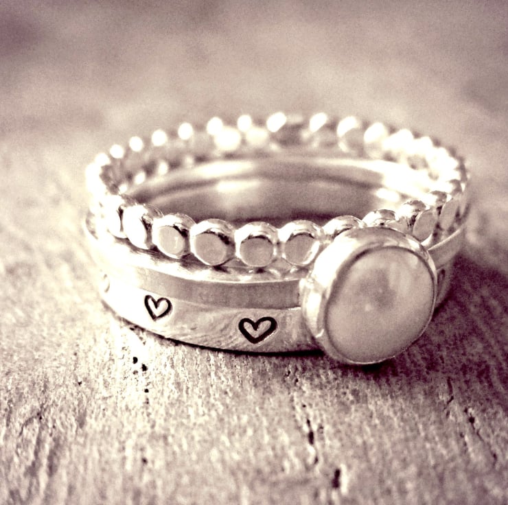 This stack features (alongside your Pearl ring) a Silver (2mm) flat bead band and a sweet little heart stamped ring. The Pearl is 6mm round.