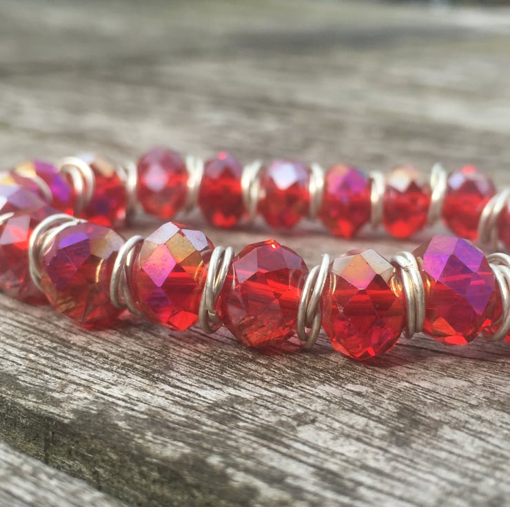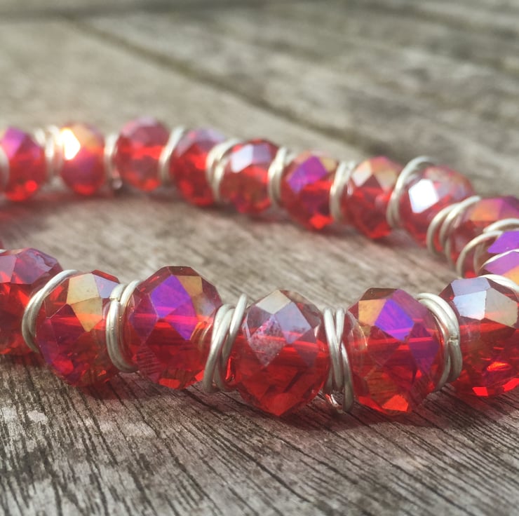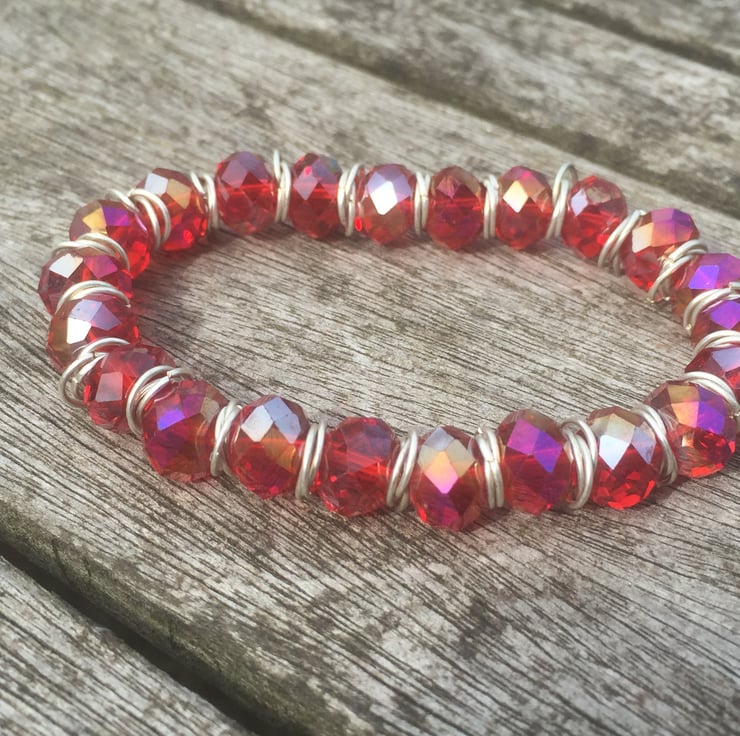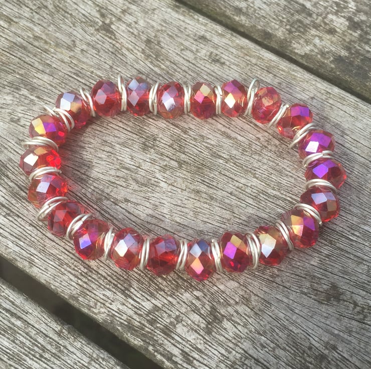 Red cut glass with silver plated jump rings on elasticated bracelet.
