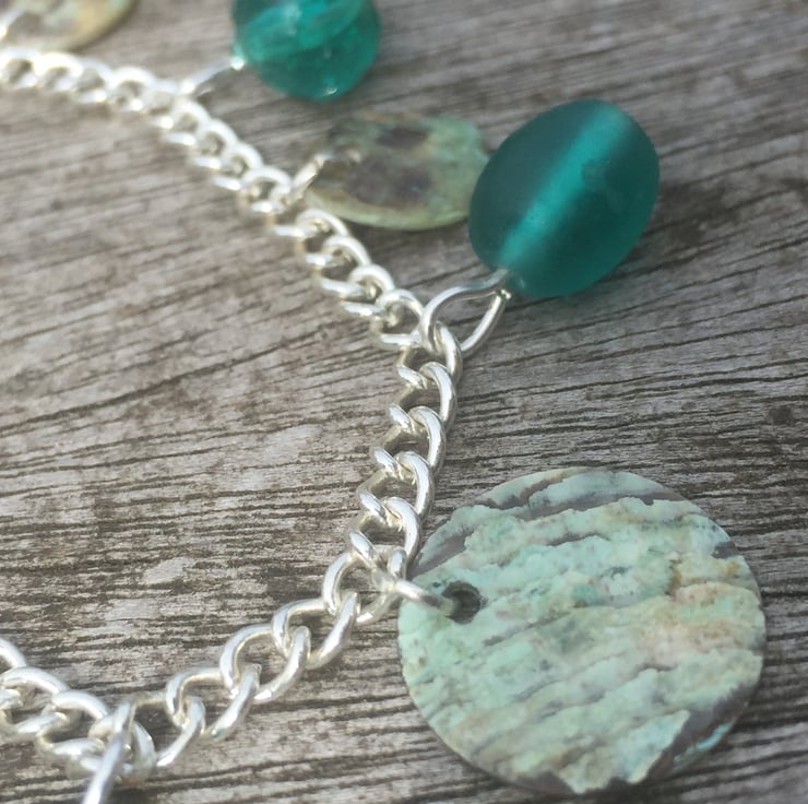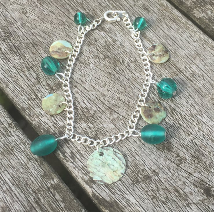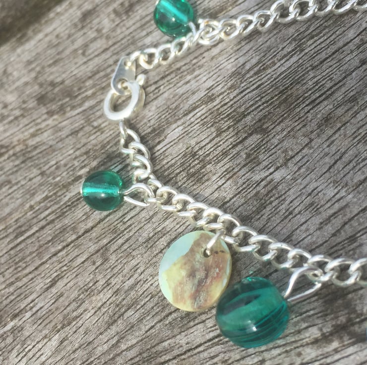 Different size and shaped turquoise/green glass beads with circle shell pieces on a silver plated bracelet with silver plated findings.