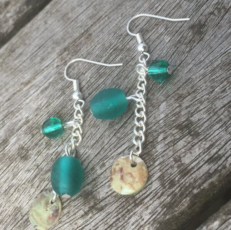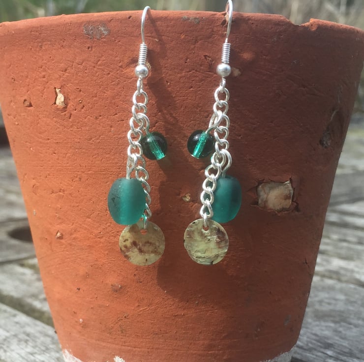 Two different size and shaped turquoise/green glass beads with circle shell piece on a silver plated chain and silver plated earrings findings. Matching bracelet also available on folksy.