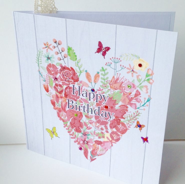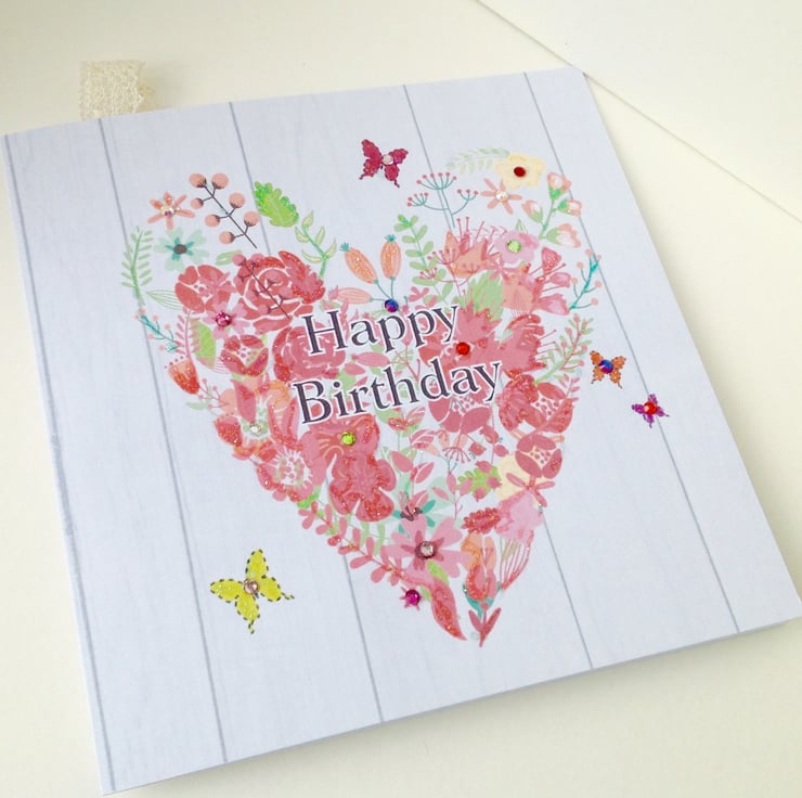 The listing is for a digital designed birthday,greeting card which has been Handfinished with crystals,glitter and sequins.