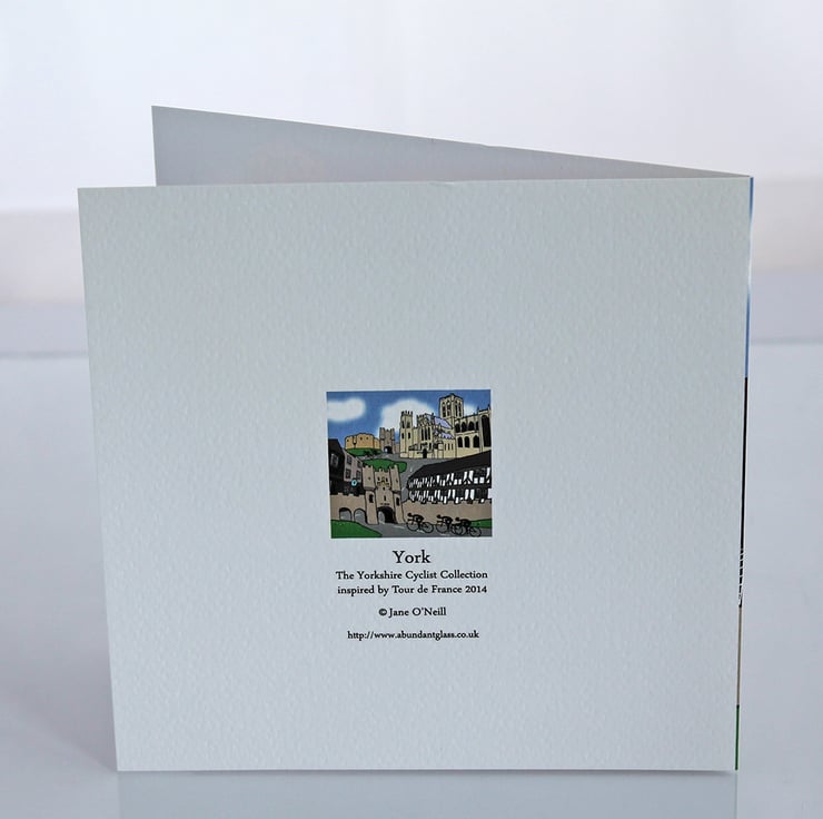 One 15cm square blank greeting card featuring a cycling race through wonderful York's city centre.