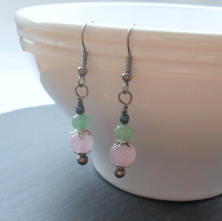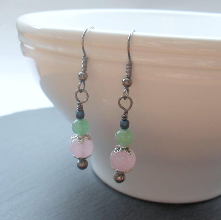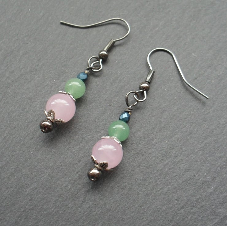 Green aventurine and pink quartzite semi precious gemstones with small Czech glass beads are attached to black plated ear wires