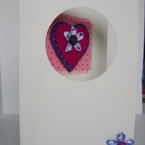 Lovely pink fabric card in shades of fuchsia and lilac, featuring ribbon and bead detail and mounted in circular aperture on white card. Finished with a ribbon and button flower on the bottom right hand corner.