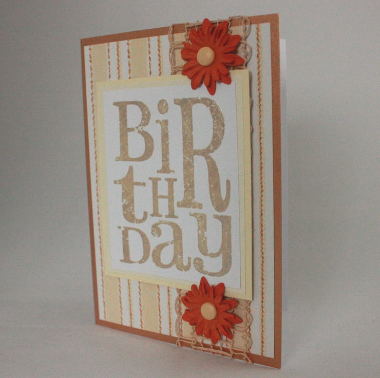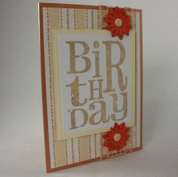 A6 copper coloured card featuring a stamped and embossed panel reading the word 'Birthday'. This has been framed by two layers of cream card and overlaid onto a striped background. The card is finished with natural raffia lace and two orange paper flowers.