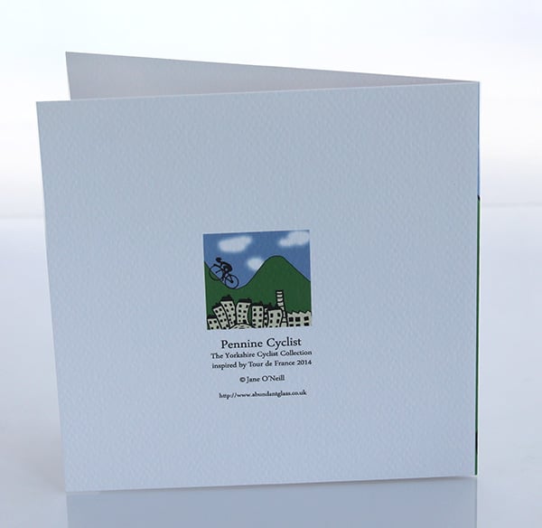 Featuring a loan cyclist on steep hills above a Pennine town with mills and houses.