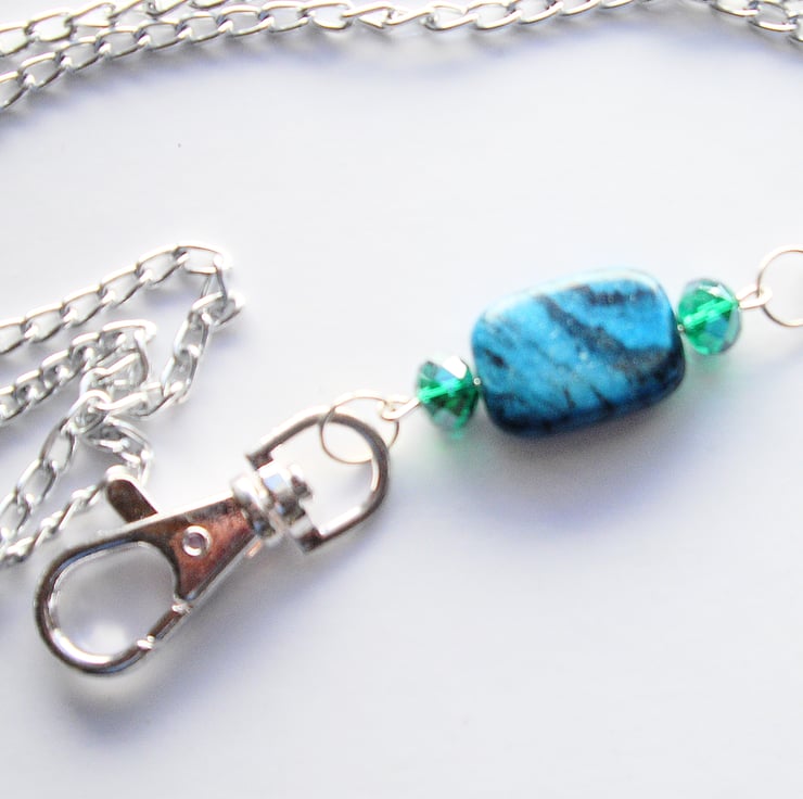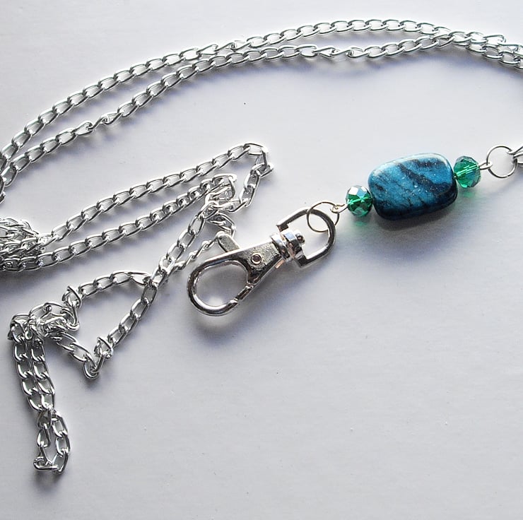 This silver plated chain lanyard has an appox 2 x 1.5 cm dark turquoise gemstone bead and smaller crystal beads.