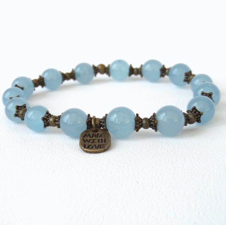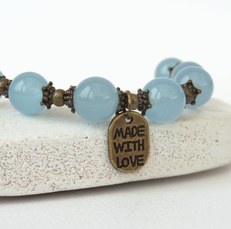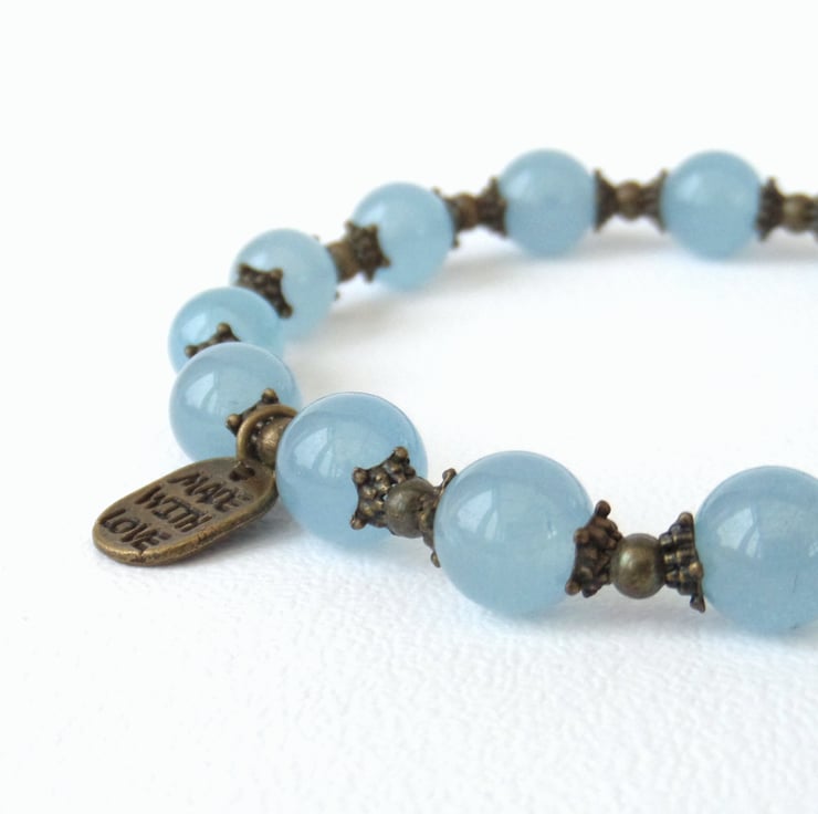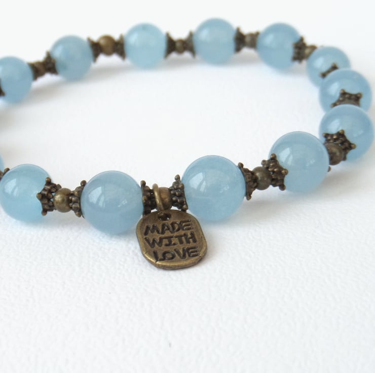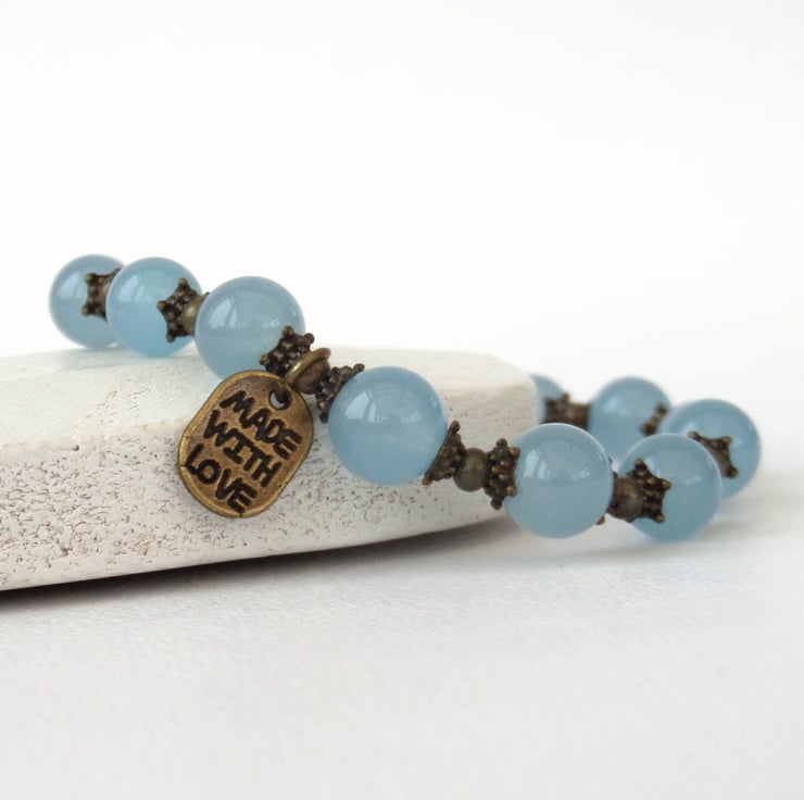 A versatile handmade bracelet, created with dyed blue jade beads and bronze beadcaps and little round beads.