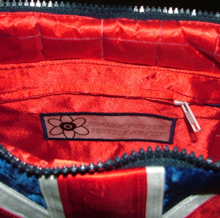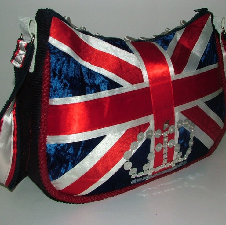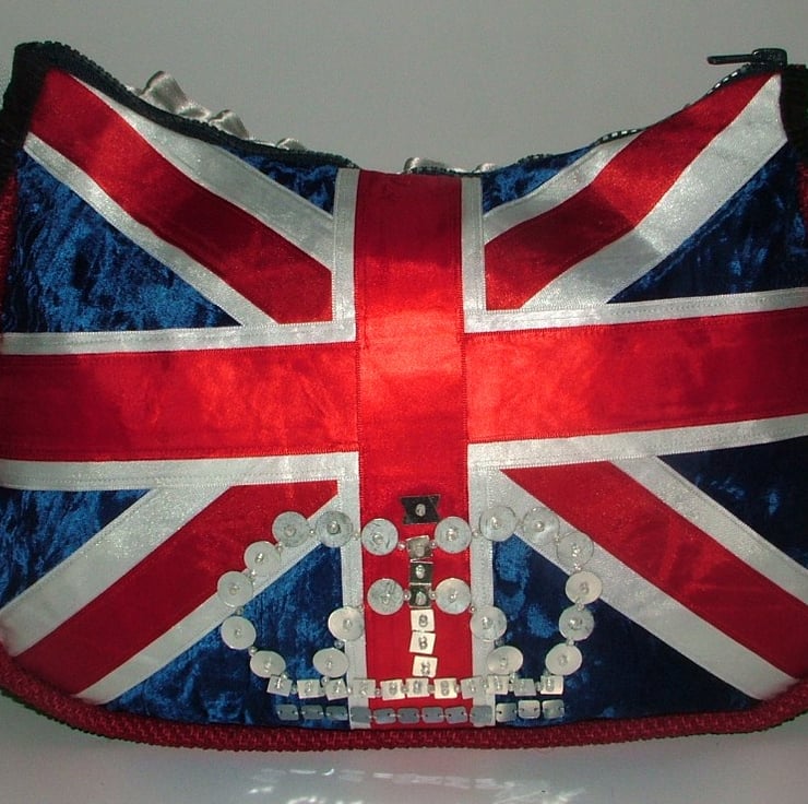 This handbag features the fabulous union jack,and what better time than when the queen reaches her 90th Birthday - so in celebration I have added a sequin crown.