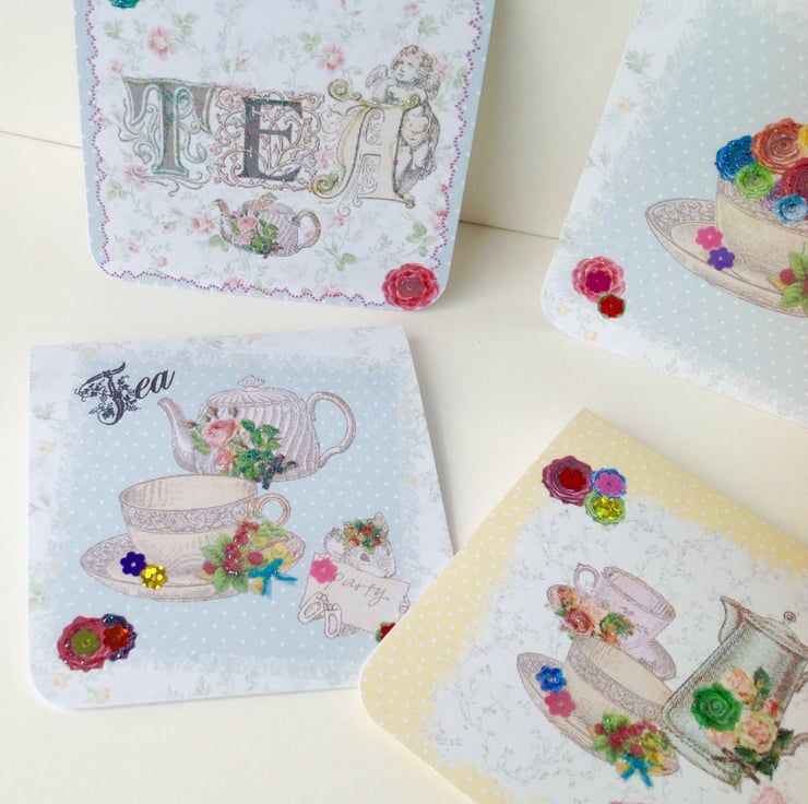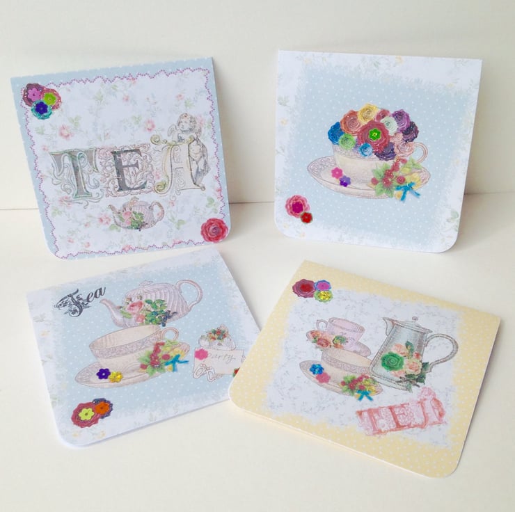 A set of four notecards with envelopes inspired by a vintage tea party theme.