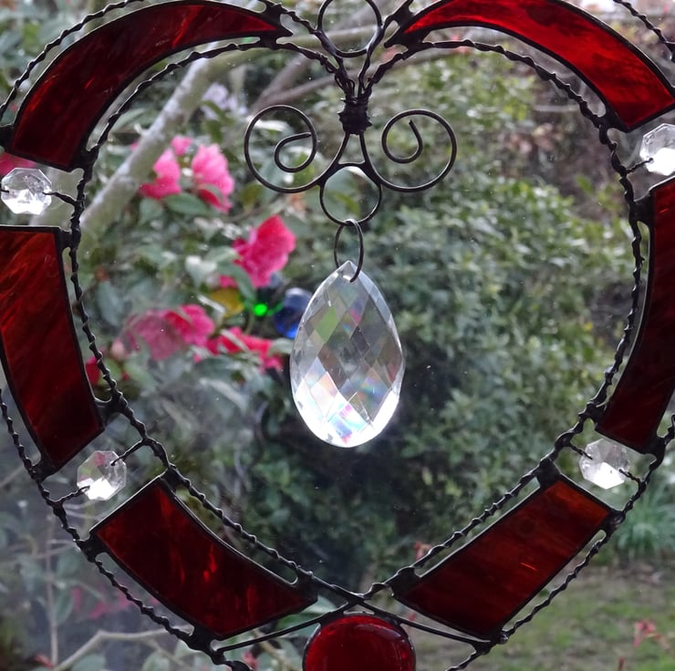 The heart has been made with tinned copper wire with thinner wire twisted around it, soldered and then a patina applied to give a blackened effect. Red streaky waterglass which has streaks of what looks like burnt orange running through it has been set inside the two wire hearts. A large cut glass chandelier tear drop with small hexagonal chandelier drops have been wired around the sides. A length of fishing line and hook have been attached for hanging purposes.