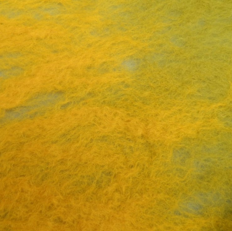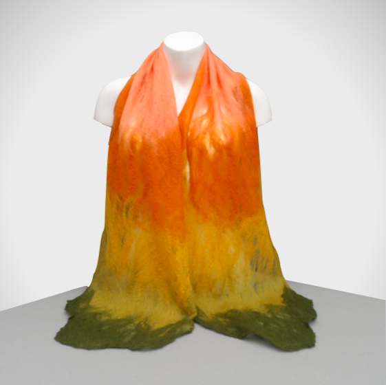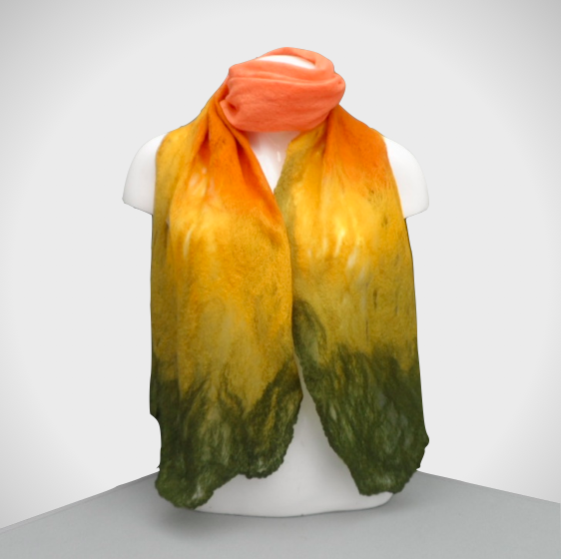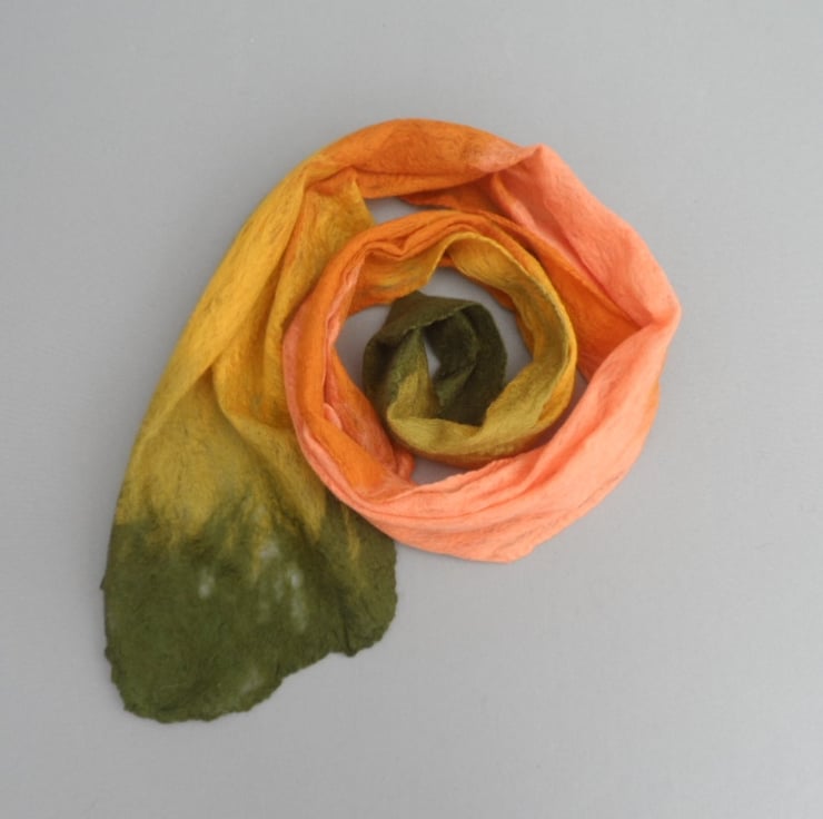 This scarf is made from 100% merino wool in shades of orange, yellow and green. It has been felted using a very fine layer of woollen fibres to create "cobweb" felt, a light and airy almost transparent material. The fineness of the layers causes small "holes" to appear. This is part of the design of the scarf and in no way affects its integrity.