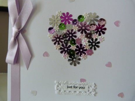 A completely handmade and uniue designed card. Consisting of a heart shape filled in with assorted sequins in pastel shades. Tiny hearts surround the heart. Just for you mounted onto white lace and finished off with pale lilac ribbon and bow