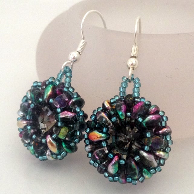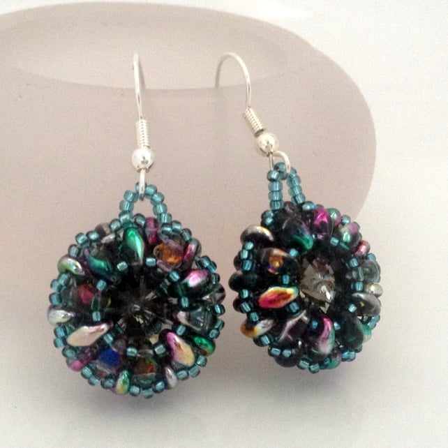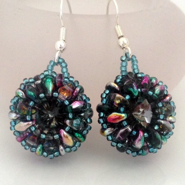 These beautiful earrings have been created by encasing a grey crystal rivoli in magic peacock twin beads. I have then added extra detail with silver lined teal seed beads that compliment the twin beads. The completed design measures approximately 2cm (13/16").