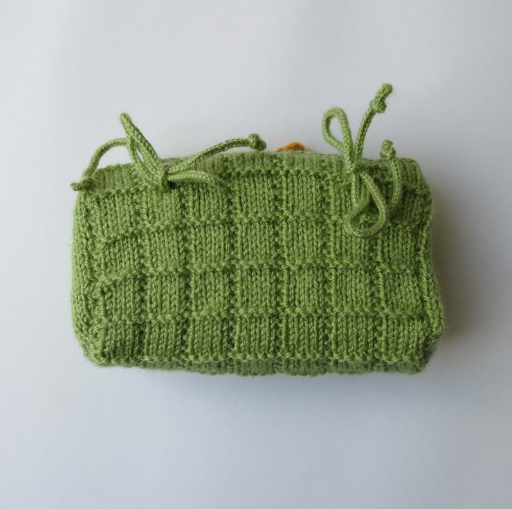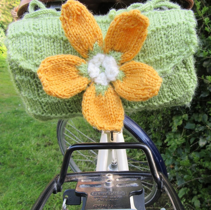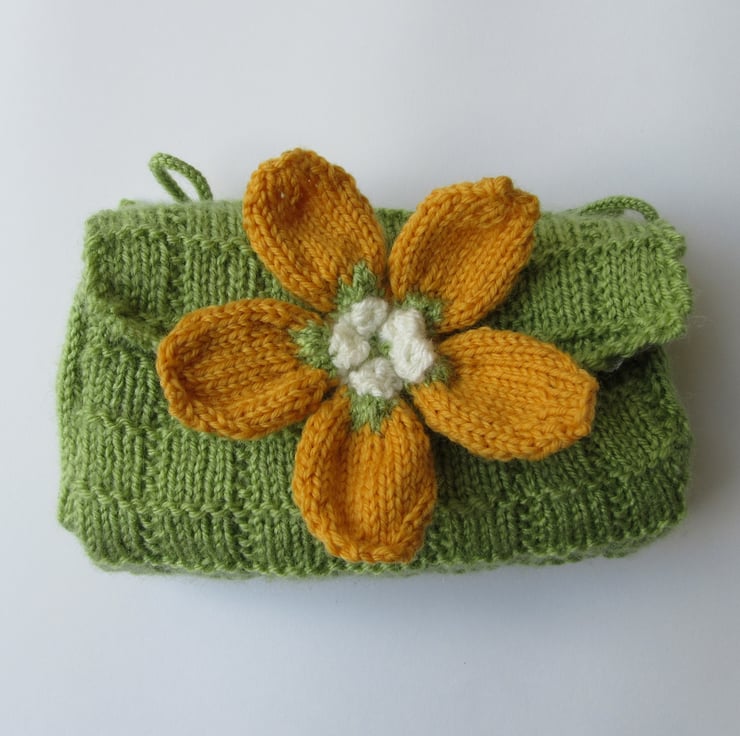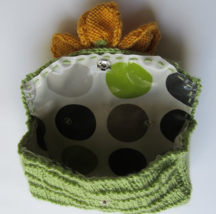 This bag is knitted in a 1940's style basket weave stitch, in a fresh leaf green coloured yarn, with a bright yellow knitted anemone flower sewn on the front.