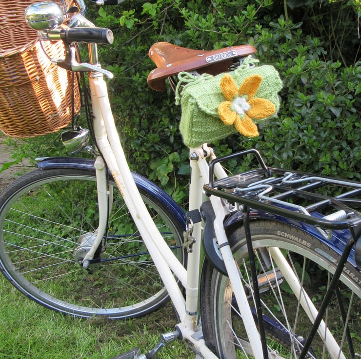 The saddle bag can be attached to back of the bike seat, using 2 x 30cm long leaf coloured handmade cord ties, which are also reinforced on the inside of the bag with little buttons.