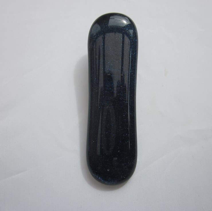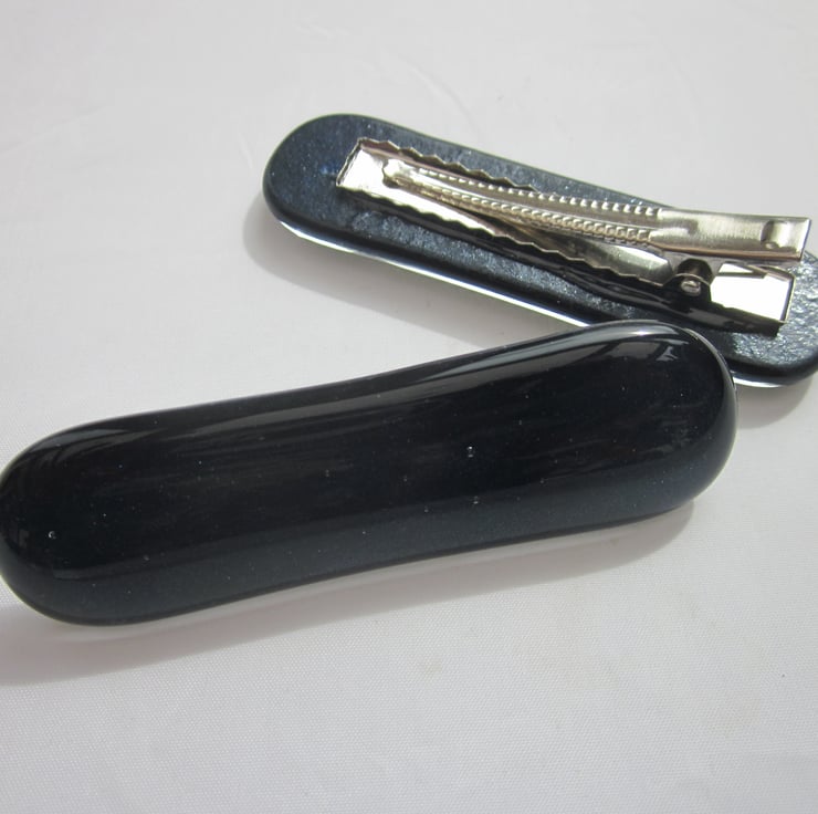 These cabochons are made from pretty dark blue aventurine glass which has it's own natural shimmer. They are fitted with silver metal crocodile clips. These are approximately 7.5cm long. They might also be used as a brooch or to fix a scarf.
