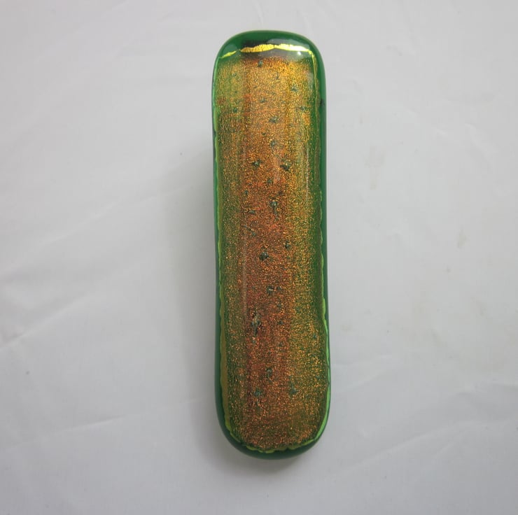 This cabochon has pretty burnt orange shimmery dichroic on a clear forest green background. The dichroic has created a crinkly opaque frame of gold-gold and deep orange. It is fitted with a silver metal crocodile clip and is approximately 8.5cm long. It might also be used as a brooch or to fix a scarf.