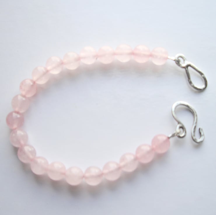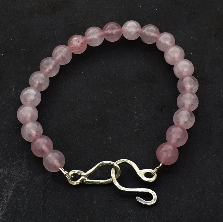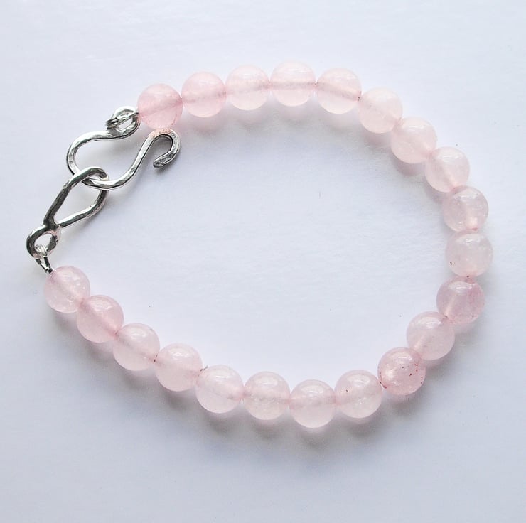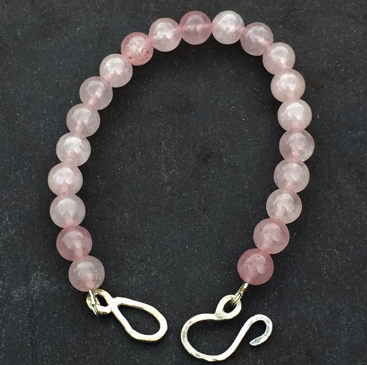 This beautiful bracelet is made from 8 mm rose quartz gemstone beads and features a large hand made hammered and soldered sterling silver clasp.