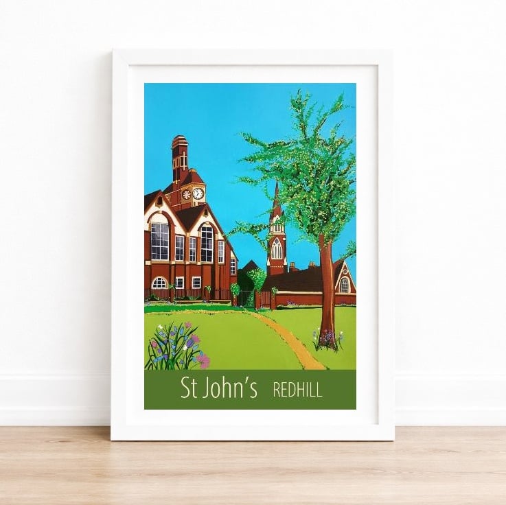 A contemporary travel poster style print of the church and school in the pretty little hamlet of St John's, Redhill, Surrey, from my own original acrylic painting. A perfect gift for those who love St John's!