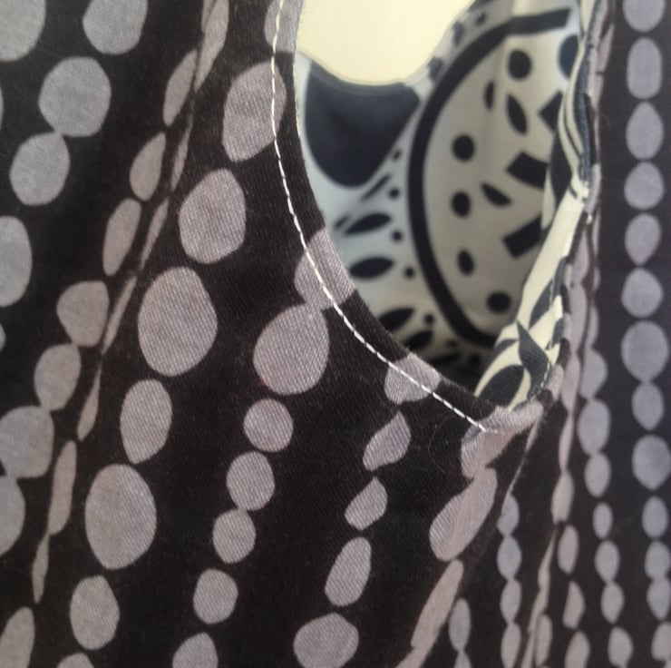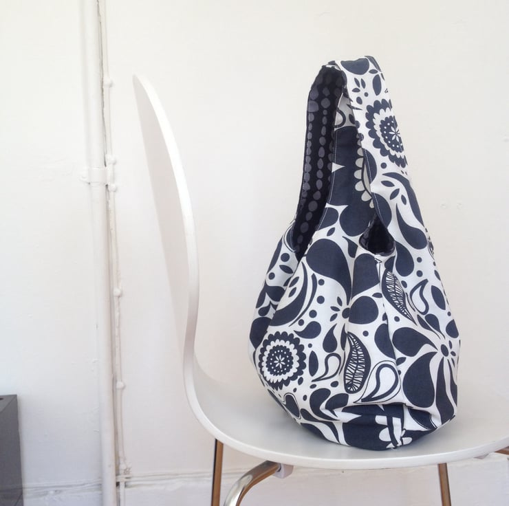 A fully reversible hobo style shoulder or handbag. One side is an ikea canvas print and the other is a cotton designer print from the Copenhagen print factory. A roomy, usable bag. Finished with contrast stitching.