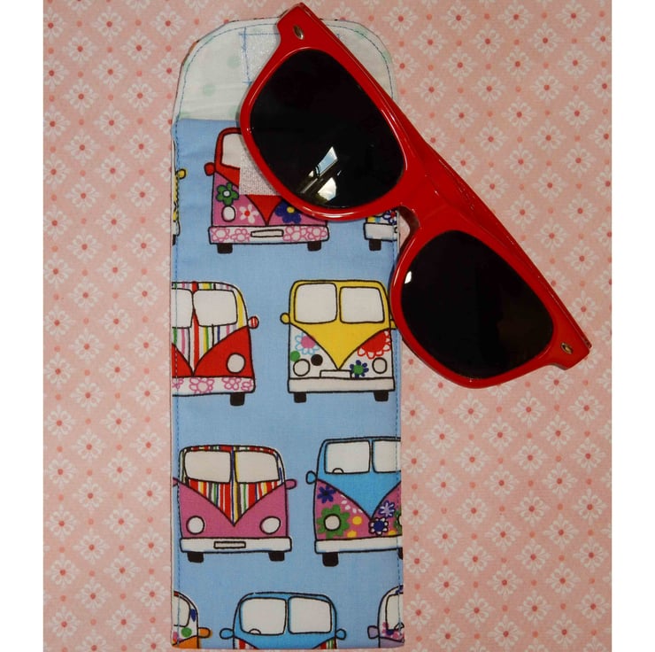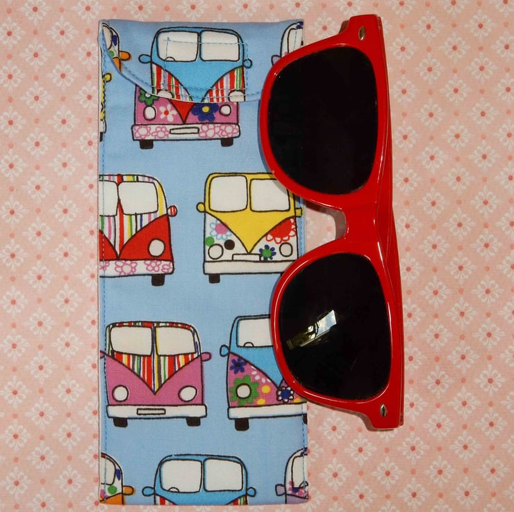 This is a handy case for your glasses or sunglasses, which is made from a beautiful bright print cotton fabric featuring campervans. It has a spot print lining. It also has a layer of wadding for protection. The case fastens with Velcro. Perfect for campervan fans, and ideal for anyone's holiday.