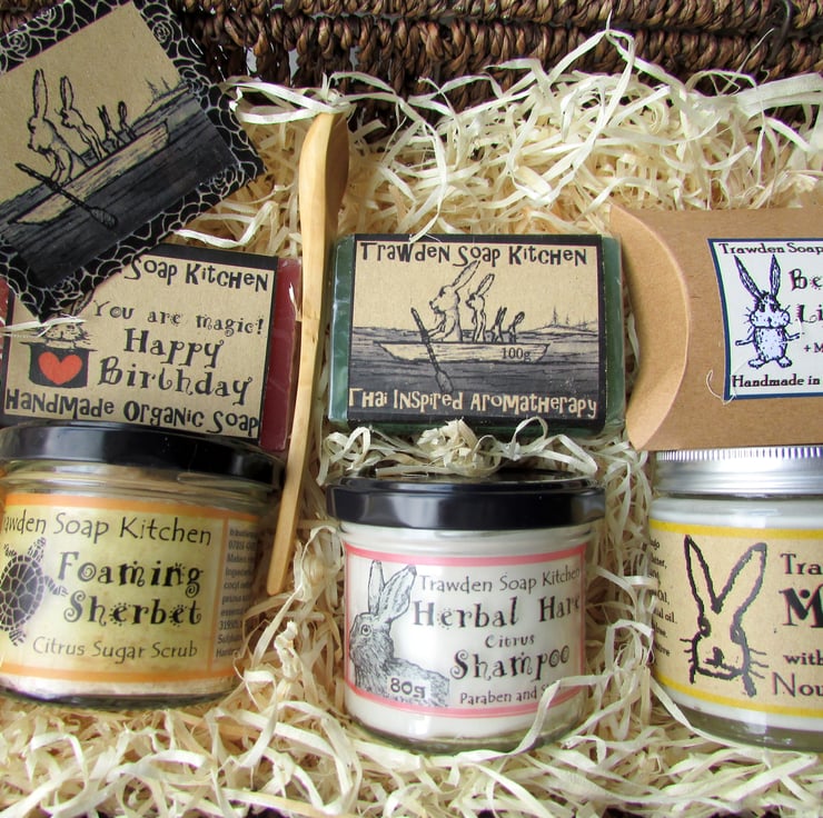 As discussed in messages. Seagrass hamper with 2 x soaps & beeswax lip balms, small Herbal Hare Citrus, large Mango Joe, sm Foaming Sherbet Scrub.
