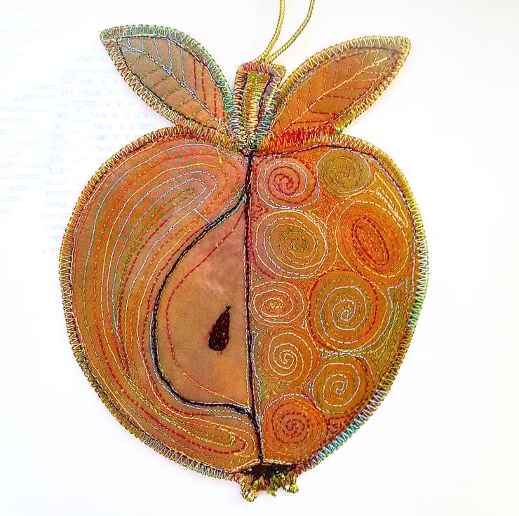 This is a handmade machine stitched textile hanging decoration. Made using layers of fabric including silk and hand dyed Egyptian cotton.
