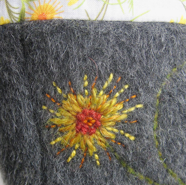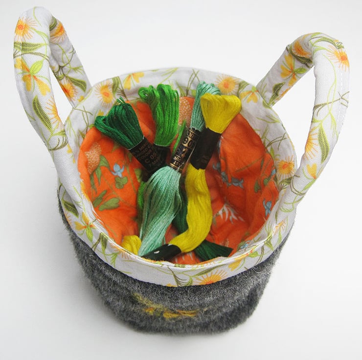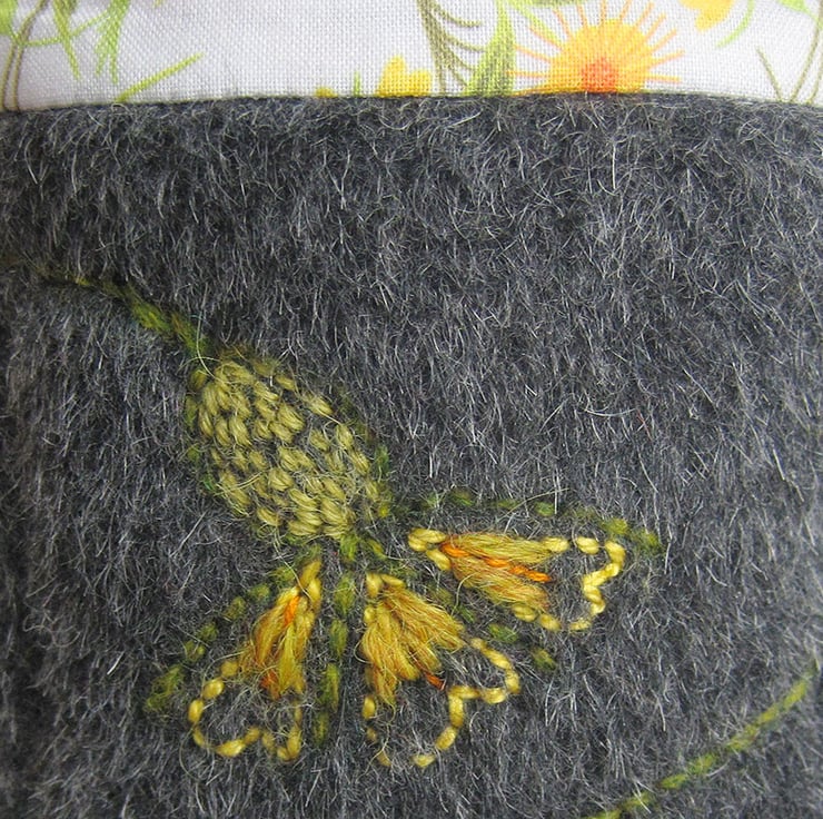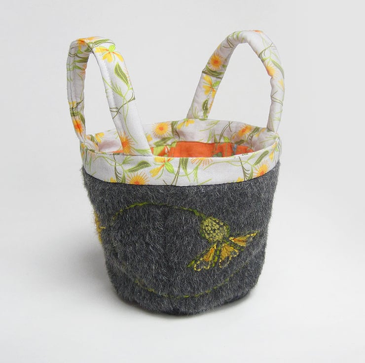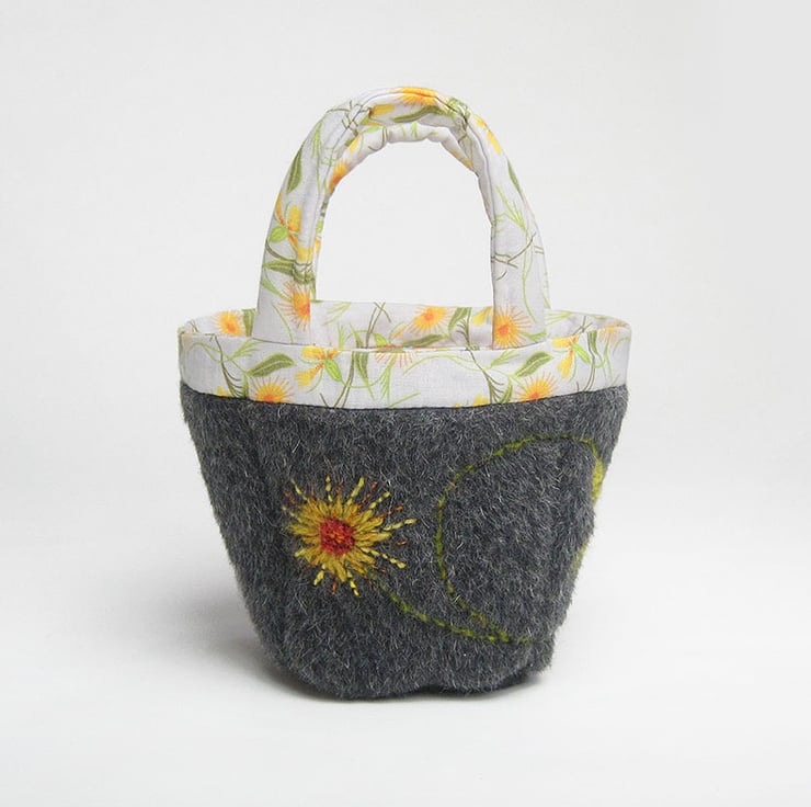 This is a small project bag for little tiny items. It is made from beautiful wool/mohair and alpaca mix fabric in charcoal. It is lined and trimmed in my own cotton print fabrics, orange dead nettle for the lining and marigold for the handles. I have hand embroidered marigolds on two sides of the outside. The bag is bucket shaped so you can find your tiny things. The depth of the bag is 10.5 cms(4 inches) and the base measures 7 cms square(2.75 inches square).