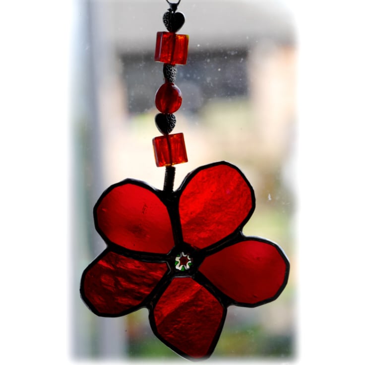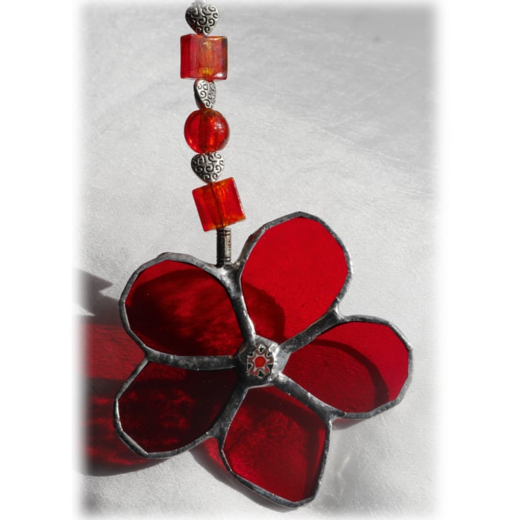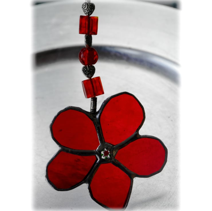 It is a pretty little red flower with 5 petals made from 3 types of glass. It has a pretty flower bead at the centre and it hangs from wire which has been strung with red beads separated with little silver heart beads.