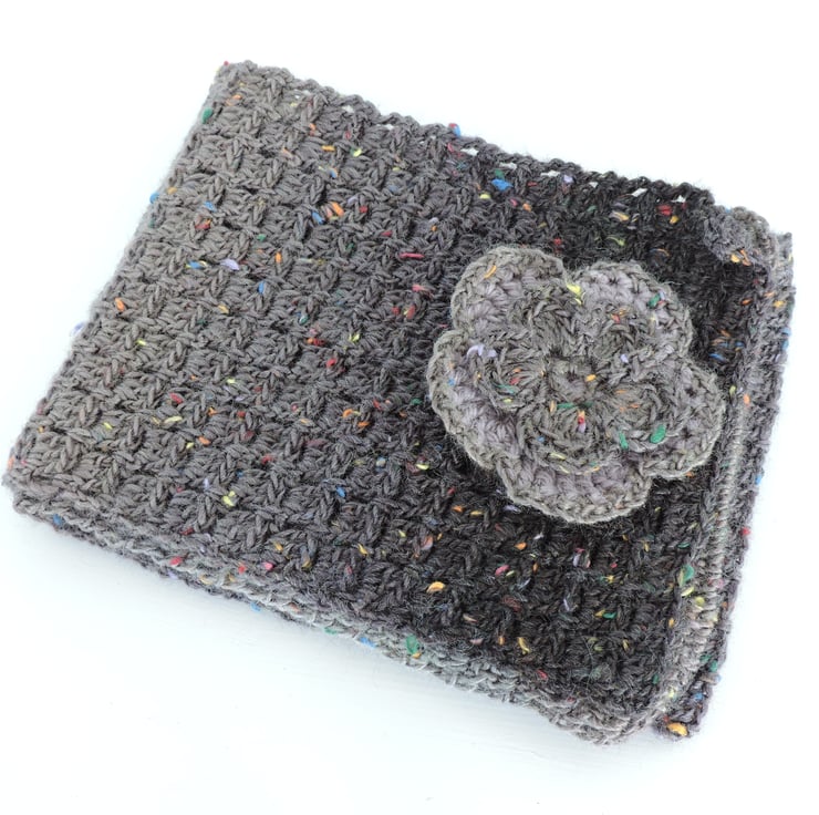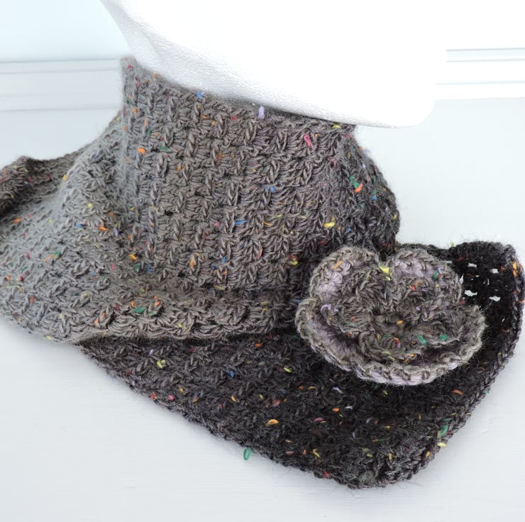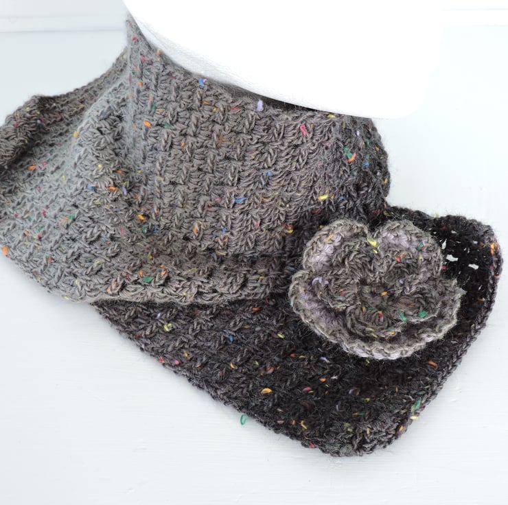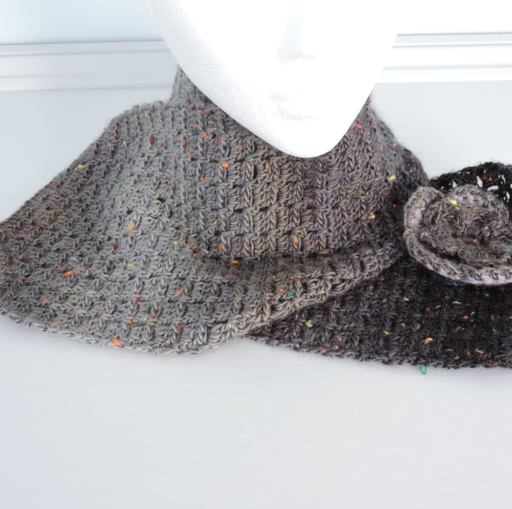 Graduated from charcoal to pale grey with a tweed effect. This is a short scarf that can be fastened with the double layer crochet brooch to act as a neck warmer. The brooch is detachable and has a brooch back safety fastener.