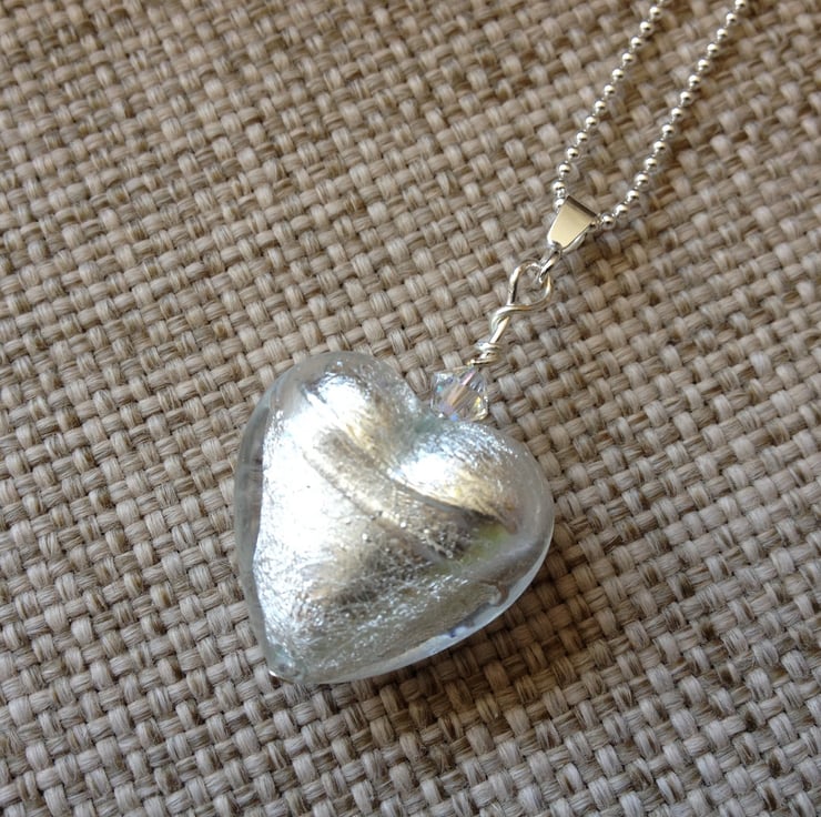 A beautiful Italian Murano glass heart in silver-white (approximately 2cm in diameter), with a sparkly Swarovski crystal on a sterling silver ball chain necklace (choice of 16 or 18 inch chain). Murano glass is made on the Venetian island of Murano using traditional techniques. It is truly stunning and makes lovely eye-catching jewellery to finish off any outfit, day or night!