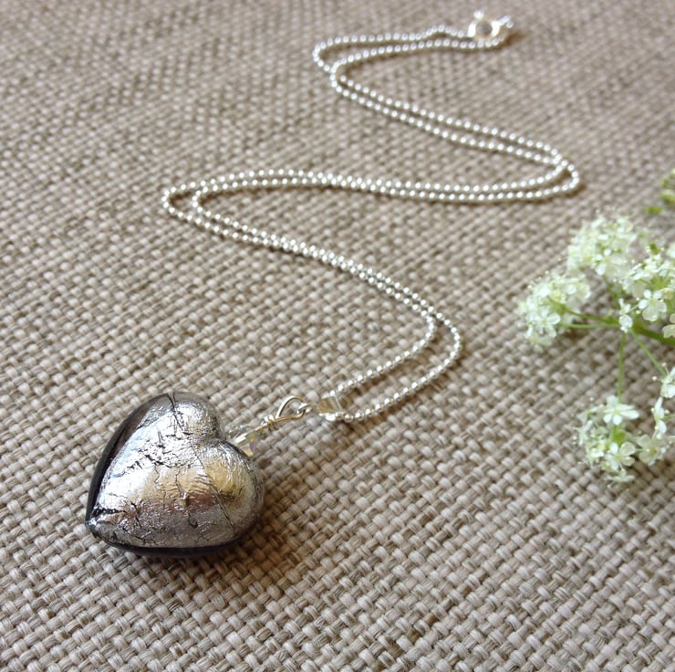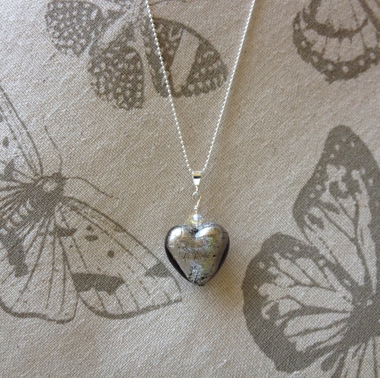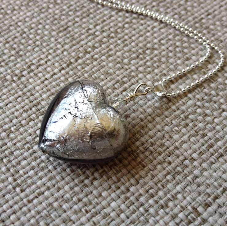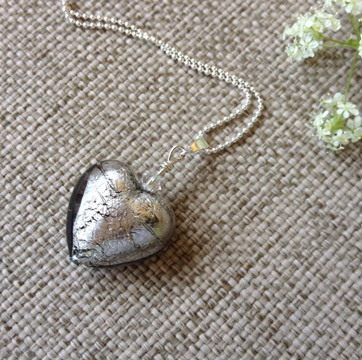 A beautiful Italian Murano glass heart in silver-grey (approximately 2cm in diameter), with a sparkly Swarovski crystal on a sterling silver ball chain necklace (choice of 16 or 18 inch chain length). Murano glass is made on the Venetian island of Murano using traditional techniques. It is truly stunning and makes lovely eye-catching jewellery to finish off any outfit, day or night!