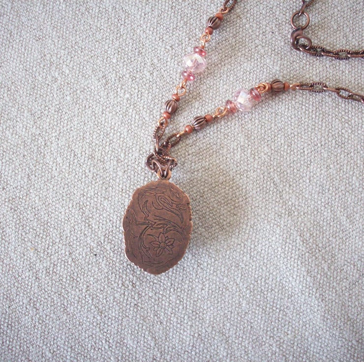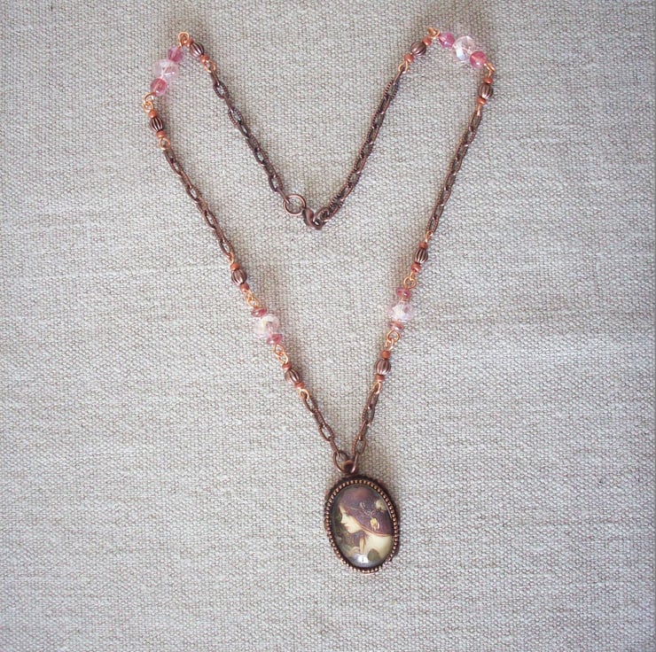 Necklace with found image, detail of this Pre-Raphaelite painting. Soft peach and copper tones, melon beads and faceted sparkle contrast with each other. Comes to you in an organza bag. I always use Special Delivery for insurance cover for both buyer and seller. Thanks for looking and for supporting hand-made!