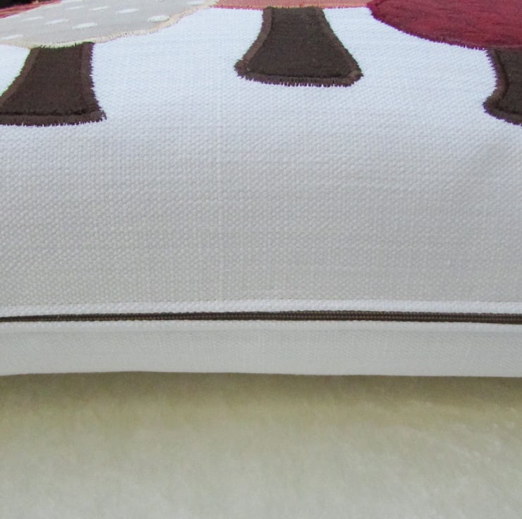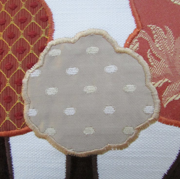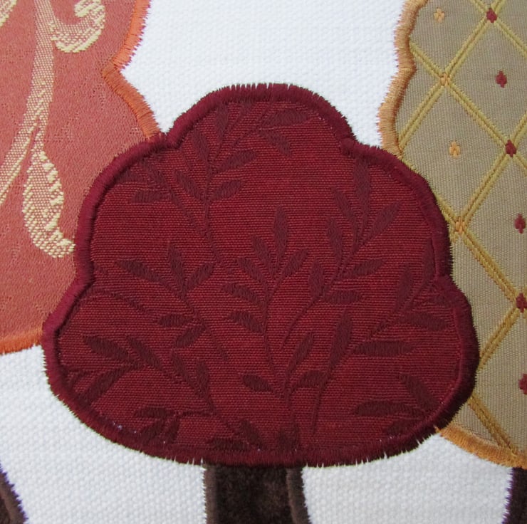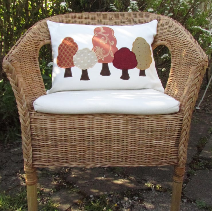 A rectangular cushion in a lovely ivory cream fabric appliqued with five trees in Autumn colours. The trees consist of a variety of fabrics with wonderful woven or textured patterns in warm Autumnal shades of terracotta, red and gold. The trunks are made from a lovely rich brown velvet-finish fabric.