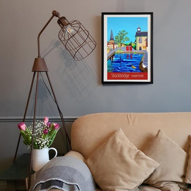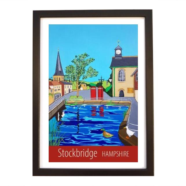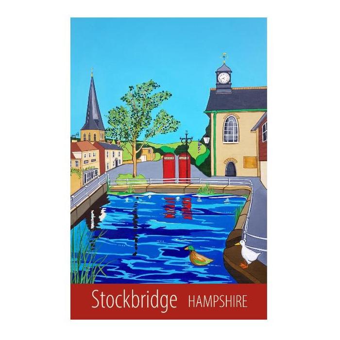 A contemporary travel poster style print of the High Street in the pretty little village of Stockbridge in Hampshire, from my own original acrylic painting.