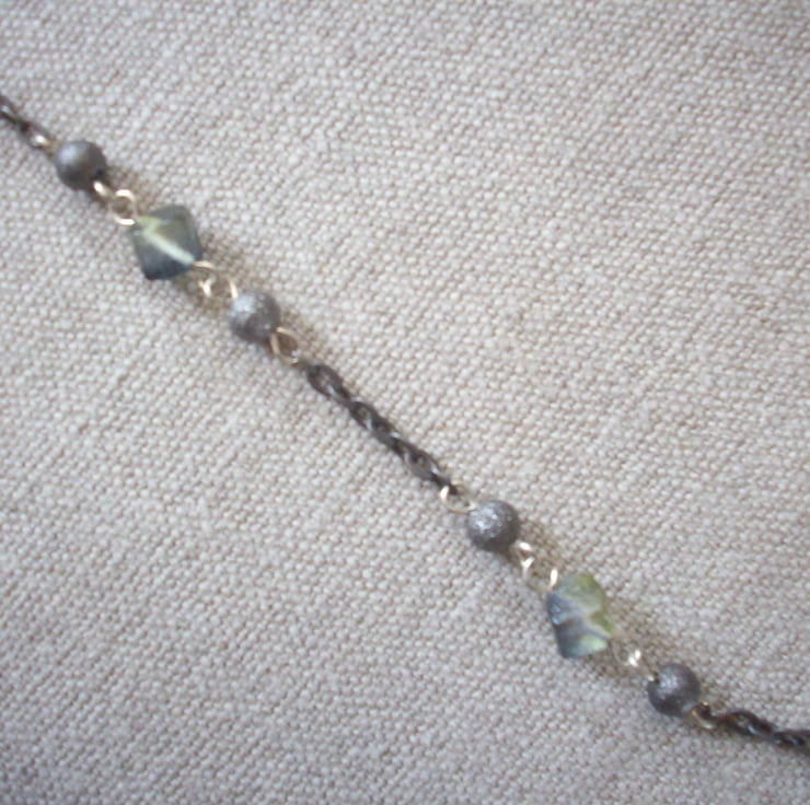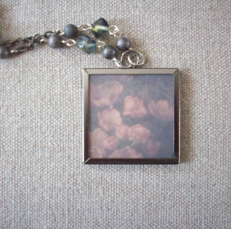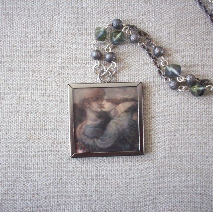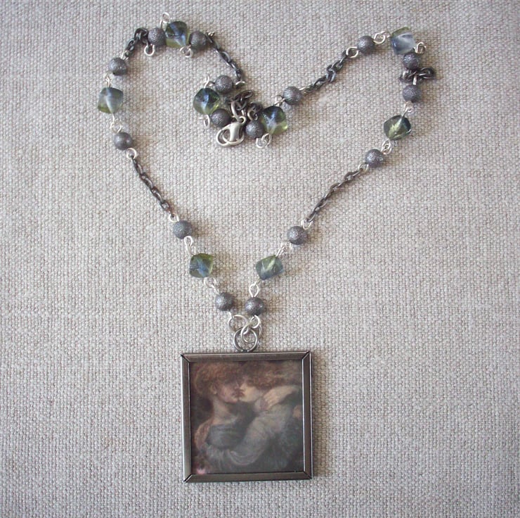 Soft subtlle shades of grey and green enhance this found image under glass, framed and made into a necklace for you. Unusual grey green ombre beads and matte pewter coloured beads form the beaded chain. It's a detail from Rossetti's painting where courting couples are seen embracing behind the Damozel. Comes to you in an organza bag. I always use Special Delivery for the insurance cover for both buyer and seller.