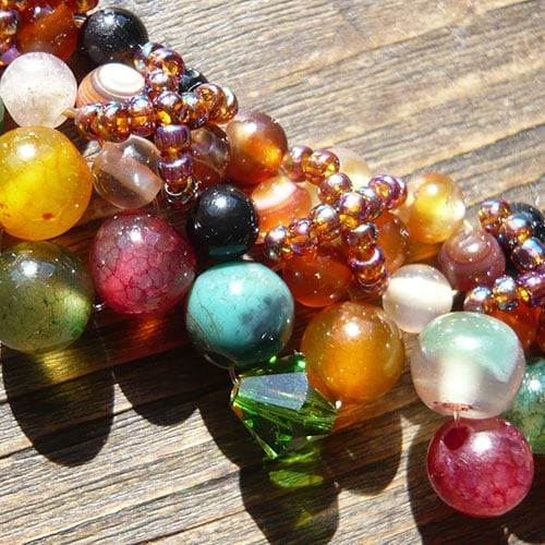 This necklace is made of semi-precious beads, seed beads and Swarovski crystals.