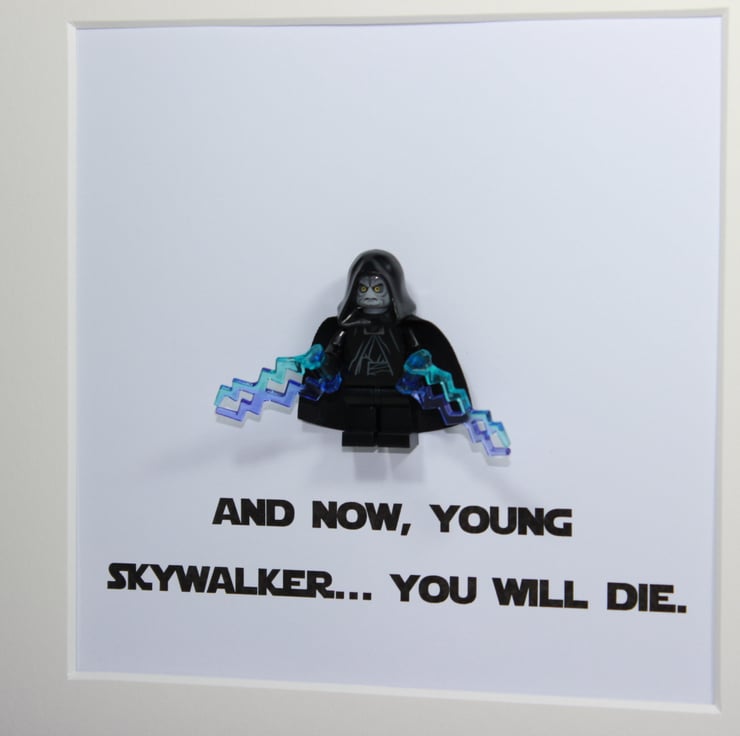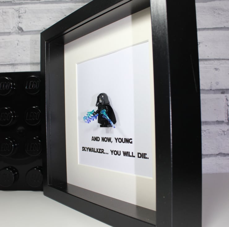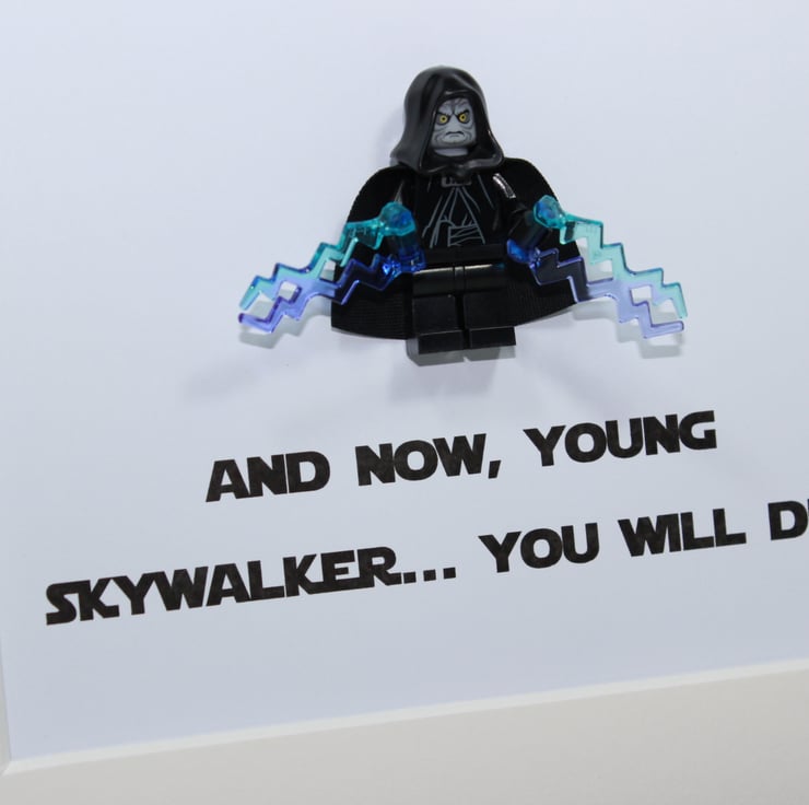 The minifigure of The Emporer have been mounted in a deep box frame together with the quote "And now young Skywalker you will die." This perfectly depicts the climactic scene from Return of the Jedi.