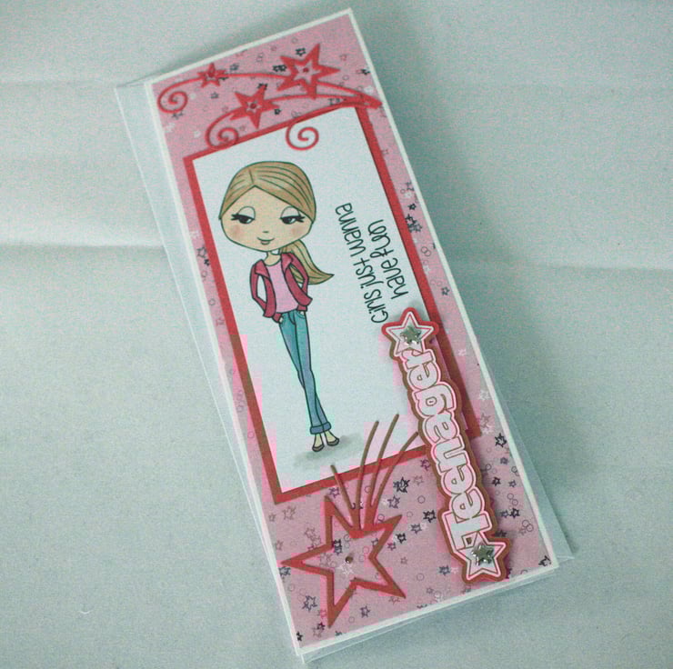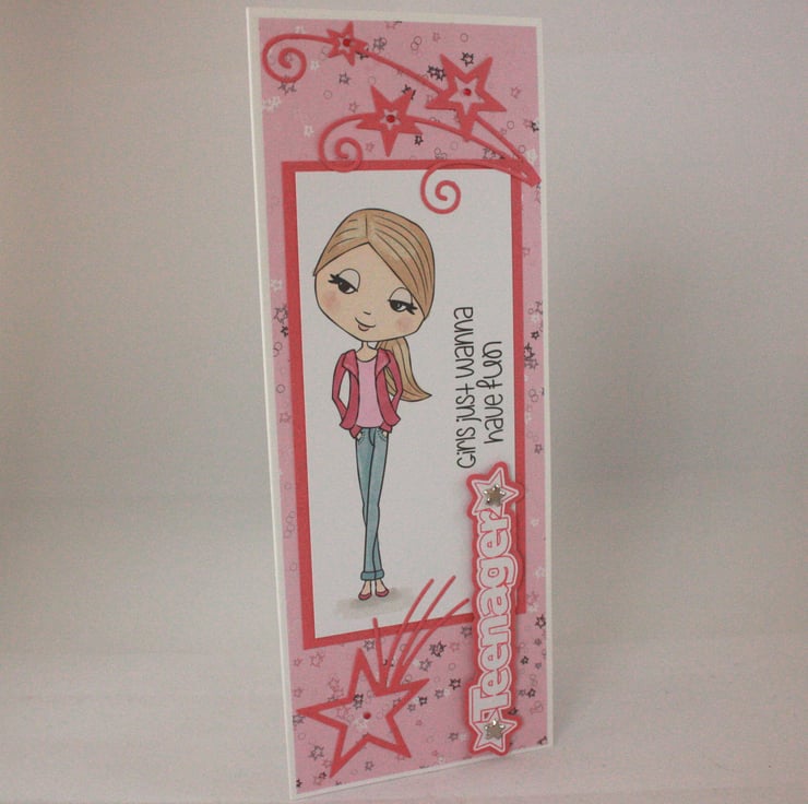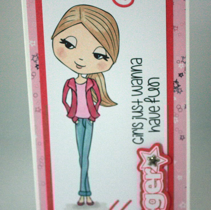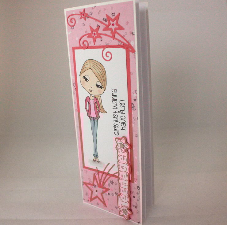 Tall birthday card suitable for a teenage girl. The card comprises a hand coloured image of a teenage girl with the quote 'Girls just wanna have fun'. The card is embellished with die cut stars and the word 'Teenager' which has been attached with silicone glue for a 3d effect and has metal star shaped brads at each end.